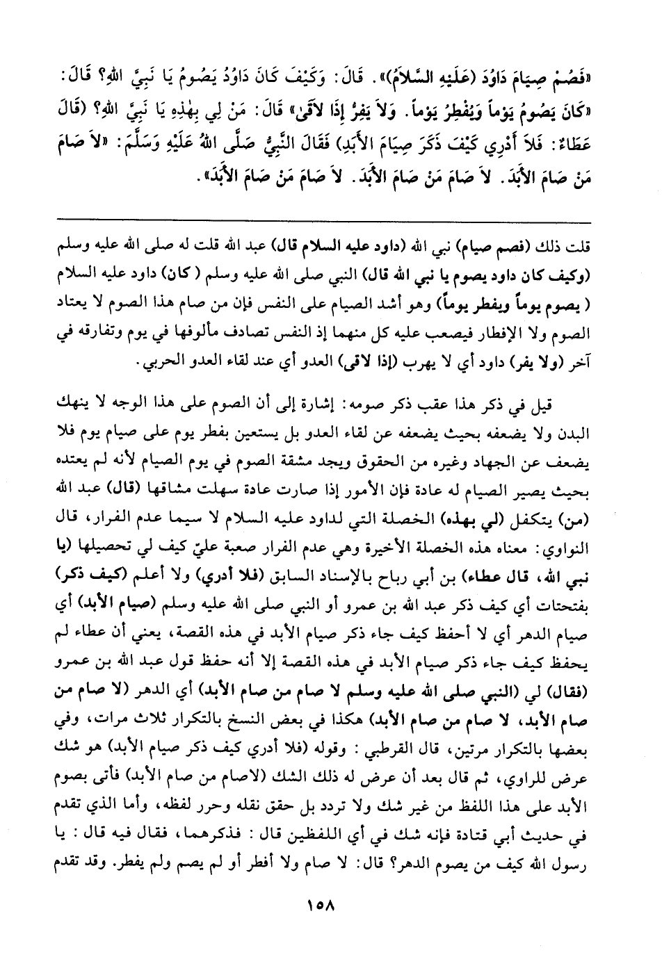 "فَصُمْ صِيَامَ دَاوُدَ (عَلَيهِ السَّلامُ ". قَال: وَكَيفَ كَانَ دَاوُدُ يَصُومُ يَا نَبِيَّ اللهِ؟ قَال: "كَانَ يَصُومُ يَوْمًا وَيُفْطِرُ يَوْمًا. وَلَا يَفِرُّ إِذَا لاقى" قَال: مَنْ لِي بِهذِهِ يَا نَبِيَّ اللهِ؟ (قَال عَطَاءٌ: فَلَا أَدْرِي كَيفَ ذَكَرَ صِيَامَ الأَبَدِ) فَقَال النبِيُّ صَلى اللهُ عَلَيهِ وَسَلمَ: "لَا صَامَ مَنْ صَامَ الأَبَدَ. لَا صَامَ مَنْ صَامَ الأَبَدَ. لَا صَامَ مَنْ صَامَ الأَبَدَ"