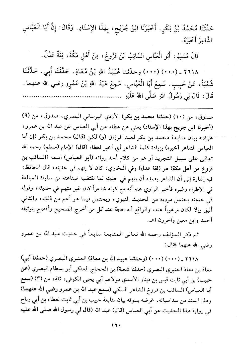 صدوق، من (١٠) (حدثنا محمد بن بكر) الأزدي البرساني البصري، صدوق، من (٩) (أخبرنا ابن جريج بهذا الإسناد) يعني عن عطاء عن أبي العباس عن عبد الله بن عمرو، غرضه بيان متابعة محمد بن بكر لعبد الرزاق (و) لكن (قال) محمد بن بكر (إن أبا العباس الشاعر أخبره) بزيادة كلمة الشاعر أي أخبر لعطاء (قال) الإمام (مسلم) رحمه الله تعالى على سبيل التجريد أو هو من كلام أحد رواته (أبو العباس) اسمه (السائب بن فروخ من أهل مكة) هو (ثقة عدل) وفي البخاري: كان لا يتهم في حديثه، قال الحافظ: فيه إشارة إلى أن الشاعر بصدد أن يتهم في حديثه لما تقتضيه صناعته من سلوك المبالغة في الإطراء وغيره فأخبر الراوي عنه أنه مع كونه شاعرًا كان غير متهم في حديثه، وقوله في حديثه يحتمل مرويه من الحديث النبوي، ويحتمل فيما هو أعم من ذلك، والثاني أليق وإلا لكان مرغوبًا عنه، والواقع أنه حجة عند كل من أخرج الصحيح وأفصح بتوثيقه أحمد وابن معين وآخرون اهـ.