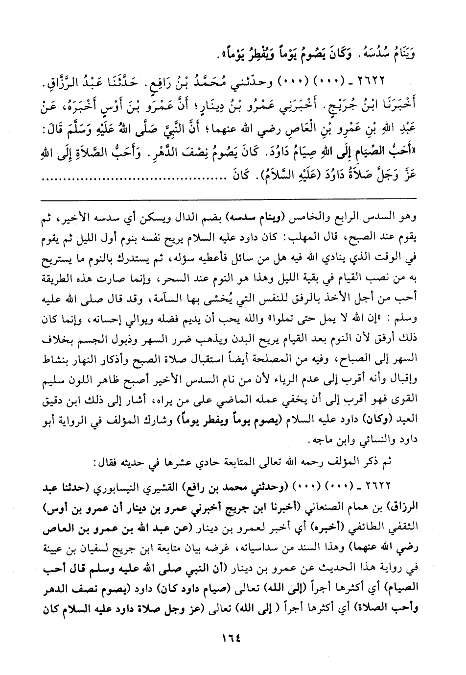 ٢٦٢٢ - (٠٠) (٠٠) (وحدثني محمد بن رافع) القشيري النيسابوري (حدثنا عبد الرزاق) بن همام الصنعاني (أخبرنا ابن جريج أخبرني عمرو بن دينار أن عمرو بن أوس) الثقفي الطائفي (أخبره) أي أخبر لعمرو بن دينار (عن عبد الله بن عمرو بن العاص رضي الله عنهما) وهذا السند من سداسياته، غرضه بيان متابعة ابن جريج لسفيان بن عيينة في رواية هذا الحديث عن عمرو بن دينار (أن النبي صلى الله عليه وسلم قال أحب الصيام) أي أكثرها أجرًا (إلى الله) تعالى (صيام داود كان) داود (يصوم نصف الدهر وأحب الصلاة) أي أكثرها أجرًا (إلى الله) تعالى (عزَّ وجلَّ صلاة داود - عليه السلام - كان