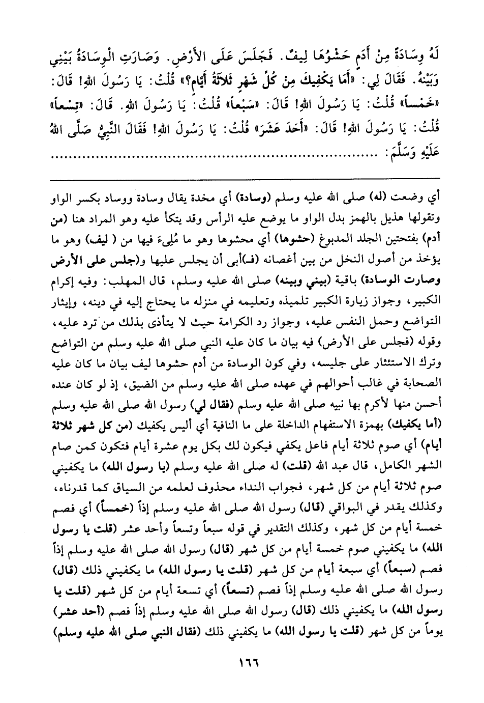 لَهُ وسَادَةً مِنْ أدَمٍ حَشْوُهَا لِيفٌ. فَجَلَسَ عَلَى الأَرْضِ. وَصَارَتِ الْوسَادَةُ بَينِي وَبَينهُ. فَقَال لِي: "أَمَا يَكْفِيكَ مِنْ كُلِّ شَهْرٍ ثَلاثَةُ أَيَّامِ؟ " قُلْتُ: يَا رَسُولَ اللهِ! قَال: "خَمْسًا" قُلْتُ: يَا رَسُولَ اللهِ! قَال: "سَبْعًا" قُلْتُ: يَا رَسُولَ اللهِ. قَال: "تِسْعًا" قُلْتُ: يَا رَسُولَ اللهِ! قَال: "أَحَدَ عَشَرَ" قُلْتُ: يَا رَسُولَ اللهِ! فَقَال النَّبِيُّ صَلى اللهُ عَلَيهِ وَسَلَّمَ: