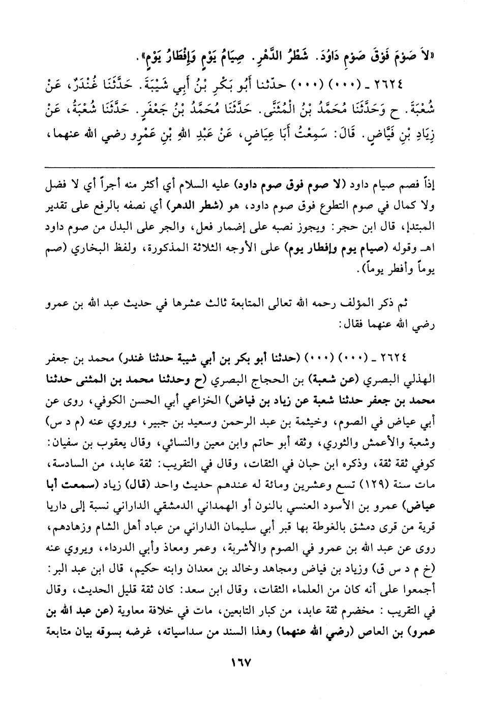 ٢٦٢٤ - (٠٠) (٠٠) (حدثنا أبو بكر بن أبي شيبة حدثنا غندر) محمد بن جعفر الهذلي البصري (عن شعبة) بن الحجاج البصري (ح وحدثنا محمد بن المثنى حدثنا محمد بن جعفر حدثنا شعبة عن زياد بن فياض) الخزاعي أبي الحسن الكوفي، روى عن أبي عياض في الصوم، وخيثمة بن عبد الرحمن وسعيد بن جبير، ويروي عنه (م د س) وشعبة والأعمش والثوري، وثقه أبو حاتم وابن معين والنسائي، وقال يعقوب بن سفيان: كوفي ثقة ثقة، وذكره ابن حبان في الثقات، وقال في التقريب: ثقة عابد، من السادسة، مات سنة (١٢٩) تسع وعشرين ومائة له عندهم حديث واحد (قال) زياد (سمعت أبا عياض) عمرو بن الأسود العنسي بالنون أو الهمداني الدمشقي الداراني نسبة إلى داريا قرية من قرى دمشق بالغوطة بها قبر أبي سليمان الداراني من عباد أهل الشام وزهادهم، روى عن عبد الله بن عمرو في الصوم والأشربة، وعمر ومعاذ وأبي الدرداء، ويروي عنه (خ م دس ق) وزياد بن فياض ومجاهد وخالد بن معدان وابنه حكيم، قال ابن عبد البر: أجمعوا على أنه كان من العلماء الثقات، وقال ابن سعد: كان ثقة قليل الحديث، وقال في التقريب: مخضرم ثقة عابد، من كبار التابعين، مات في خلافة معاوية (عن عبد الله بن عمرو) بن العاص (رضي الله عنهما) وهذا السند من سداسياته، غرضه بسوقه بيان متابعة