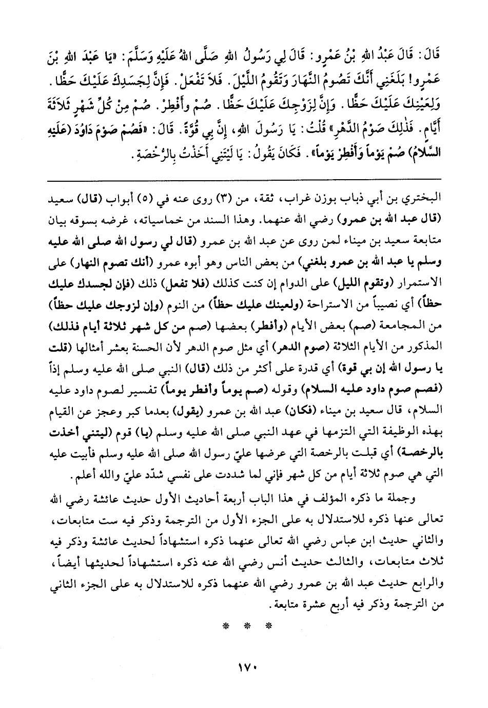قَال: قَال عَبْدُ اللهِ بْنُ عَمْرو: قَال لِي رَسُولُ اللهِ صَلَّى اللهُ عَلَيهِ وَسَلَّمَ: "يَا عَبْدَ اللهِ بْنَ عَمْرٍو! بَلَغَنِي أَنَّكَ تَصُومُ النهَارَ وَتَقُومُ اللَّيلَ. فَلَا تَفْعَلْ. فَإنَّ لِجَسَدِكَ عَلَيكَ حَظًّا. وَلعَينِكَ عَلَيكَ حَظًّا. وإنَّ لِزَوْجِكَ عَلَيكَ حَظًّا. صُمْ وأَفْطِرْ. صُمْ مِنْ كُلِّ شَهْرٍ ثَلاثَةَ أَيَّامٍ. فَذلِكَ صَوْمُ الدَّهْرِ" قُلْتُ: يَا رَسُولَ اللهِ، إِنَّ بِي قُوَّةَ. قَال: "فَصُمْ صَوْمَ دَاوُدَ (عَلَيهِ السَّلامُ) صُمْ يَوْمًا وَأَفْطِرْ يَوْمًا". فَكَانَ يَقُولُ: يَا لَيتَنِي أَخَذْتُ بِالرُّخْصَةِ