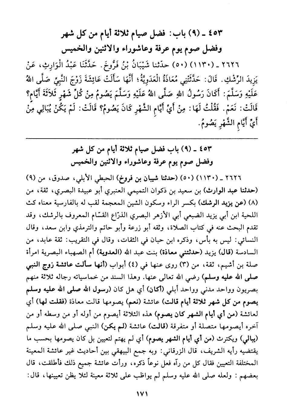 ٤٥٣ - (٩) باب فضل صيام ثلاثة أيام من كل شهر وفضل صوم يوم عرفة وعاشوراء والاثنين والخميس