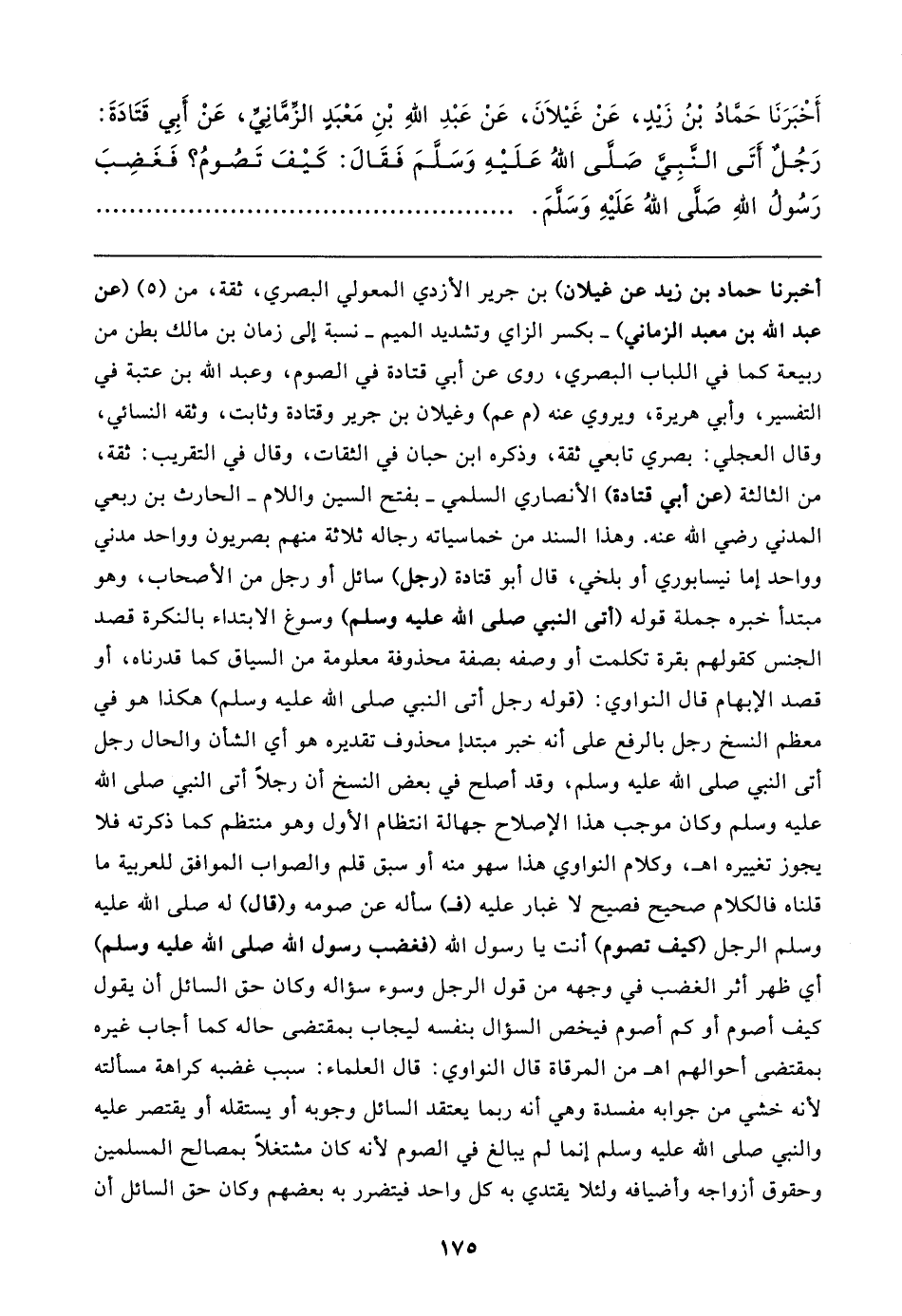 أخبرنا حماد بن زيد عن غيلان) بن جرير الأزدي المعولي البصري، ثقة، من (٥) (عن عبد الله بن معبد الزماني) -بكسر الزاي وتشديد الميم- نسبة إلى زمان بن مالك بطن من ربيعة كما في اللباب البصري، روى عن أبي قتادة في الصوم، وعبد الله بن عتبة في التفسير، وأبي هريرة، ويروي عنه (م عم) وغيلان بن جرير وقتادة وثابت، وثقه النسائي، وقال العجلي: بصري تابعي ثقة، وذكره ابن حبان في الثقات، وقال في التقريب: ثقة، من الثالثة (عن أبي قتادة) الأنصاري السلمي -بفتح السين واللام- الحارث بن ربعي المدني رضي الله عنه. وهذا السند من خماسياته رجاله ثلاثة منهم بصريون وواحد مدني وواحد إما نيسابوري أو بلخي، قال أبو قتادة (رجل) سائل أو رجل من الأصحاب، وهو مبتدأ خبره جملة قوله (أتى النبي صلى الله عليه وسلم) وسوغ الابتداء بالنكرة قصد الجنس كقولهم بقرة تكلمت أو وصفه بصفة محذوفة معلومة من السياق كما قدرناه، أو قصد الإبهام قال النواوي: (قوله رجل أتى النبي صلى الله عليه وسلم) هكذا هو في معظم النسخ رجل بالرفع على أنه خبر مبتدإ محذوف تقديره هو أي الشأن والحال رجل أتى النبي صلى الله عليه وسلم، وقد أصلح في بعض النسخ أن رجلًا أتى النبي صلى الله عليه وسلم وكان موجب هذا الإصلاح جهالة انتظام الأول وهو منتظم كما ذكرته فلا يجوز تغييره اهـ، وكلام النواوي هذا سهو منه أو سبق قلم والصواب الموافق للعربية ما قلناه فالكلام صحيح فصيح لا غبار عليه (فـ) سأله عن صومه و (قال) له صلى الله عليه وسلم الرجل (كيف تصوم) أنت يا رسول الله (فغضب رسول الله صلى الله عليه وسلم) أي ظهر أثر الغضب في وجهه من قول الرجل وسوء سؤاله وكان حق السائل أن يقول كيف أصوم أو كم أصوم فيخص السؤال بنفسه ليجاب بمقتضى حاله كما أجاب غيره بمقتضى أحوالهم اهـ من المرقاة قال النواوي: قال العلماء: سبب غضبه كراهة مسألته لأنه خشي من جوابه مفسدة وهي أنه ربما يعتقد السائل وجوبه أو يستقله أو يقتصر عليه والنبي صلى الله عليه وسلم إنما لم يبالغ في الصوم لأنه كان مشتغلًا بمصالح المسلمين وحقوق أزواجه وأضيافه ولئلا يقتدي به كل واحد فيتضرر به بعضهم وكان حق السائل أن