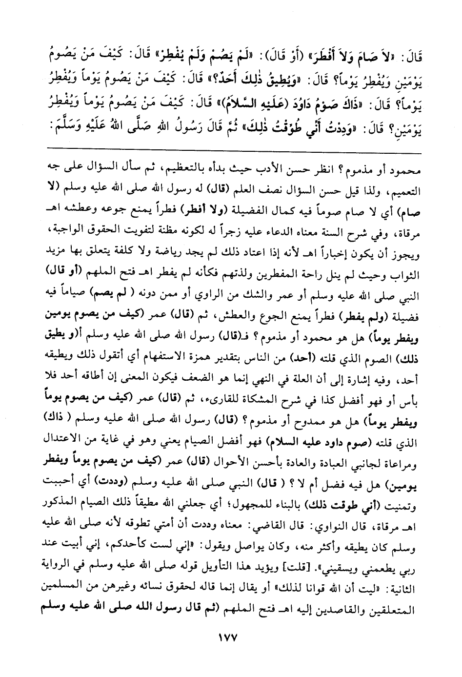 قَال: "لَا صامَ وَلَا أَفْطَرَ" (أَوْ قَال): "لَمْ يَصُمْ وَلَمْ يُفْطِرْ" قَال: كَيفَ مَنْ يَصُومُ يَوْمَينِ ويفْطِرُ يَوْمًا؟ قَال: "ويطِيقُ ذلِكَ أَحَدٌ؟ " قَال: كَيفَ مَنْ يَصُومُ يَوْمًا ويفْطِرُ يَوْمًا؟ قَال: "ذَاكَ صَوْمُ دَاوُدَ (عَلَيهِ السَّلامُ) " قَال: كَيفَ مَنْ يَصُومُ يَوْمًا ويفْطِرُ يَوْمَينِ؟ قَال: "وَدِدْتُ أَني طُوِّقْتُ ذلِكَ" ثُمَّ قَال رَسُولُ اللهِ صَلَّى اللهُ عَلَيهِ وَسَلَّمَ: