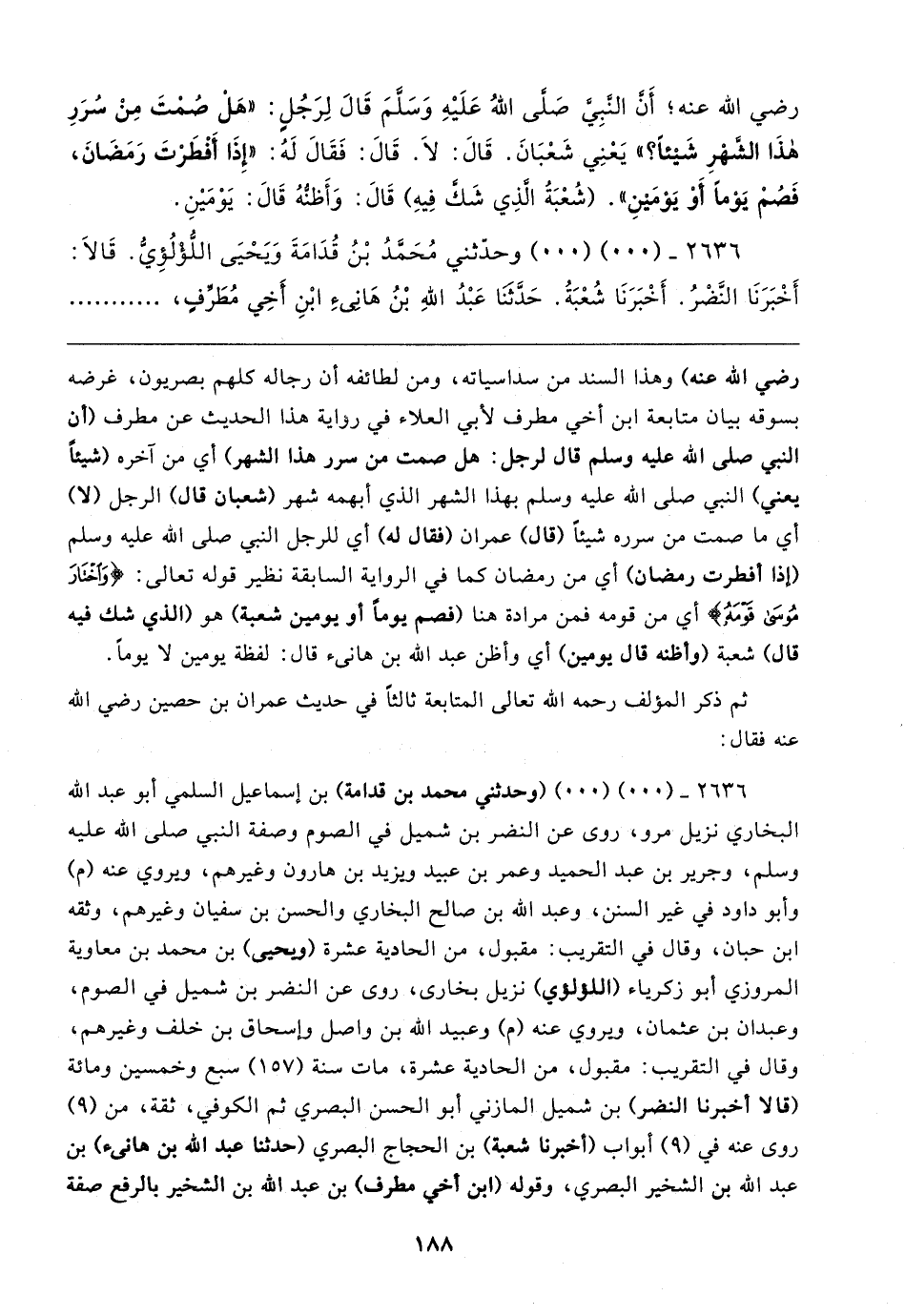 ٢٦٣٦ - (٠٠) (٠٠) (وحدثني محمد بن قدامة) بن إسماعيل السلمي أبو عبد الله البخاري نزيل مرو، روى عن النضر بن شميل في الصوم وصفة النبي صلى الله عليه وسلم، وجرير بن عبد الحميد وعمر بن عبيد ويزيد بن هارون وغيرهم، ويروي عنه (م) وأبو داود في غير السنن، وعبد الله بن صالح البخاري والحسن بن سفيان وغيرهم، وثقه ابن حبان، وقال في التقريب: مقبول، من الحادية عشرة (ويحيى) بن محمد بن معاوية المروزي أبو زكرياء (اللولوي) نزيل بخارى، روى عن النضر بن شميل في الصوم، وعبدان بن عثمان، ويروي عنه (م) وعبيد الله بن واصل وإسحاق بن خلف وغيرهم، وقال في التقريب: مقبول، من الحادية عشرة، مات سنة (١٥٧) سبع وخمسين ومائة (قالا أخبرنا النضر) بن شميل المازني أبو الحسن البصري ثم الكوفي، ثقة، من (٩) روى عنه في (٩) أبواب (أخبرنا شعبة) بن الحجاج البصري (حدثنا عبد الله بن هانئ) بن عبد الله بن الشخير البصري، وقوله (ابن أخي مطرف) بن عبد الله بن الشخير بالرقع صقة