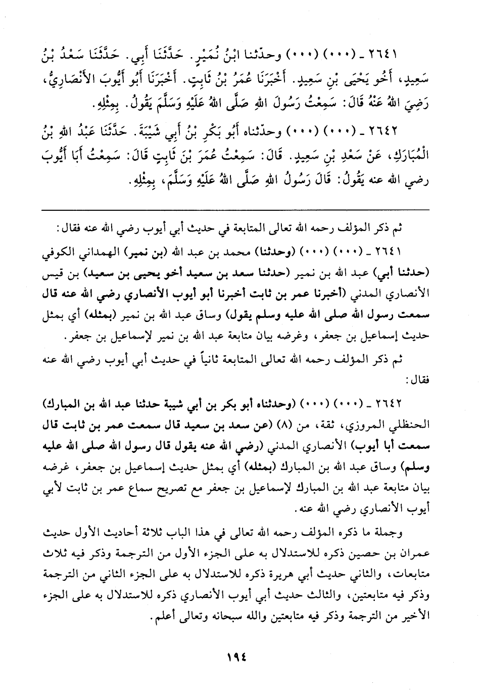 ٢٦٤١ - (٠٠) (٠٠) (وحدثنا) محمد بن عبد الله (بن نمير) الهمداني الكوفي (حدثنا أبي) عبد الله بن نمير (حدثنا سعد بن سعيد أخو يحيى بن سعيد) بن قيس الأنصاري المدني (أخبرنا عمر بن ثابت أخبرنا أبو أيوب الأنصاري رضي الله عنه قال سمعت رسول الله صلى الله عليه وسلم يقول) وساق عبد الله بن نمير (بمثله) أي بمثل حديث إسماعيل بن جعفر، وغرضه بيان متابعة عبد الله بن نمير لإسماعيل بن جعفر.