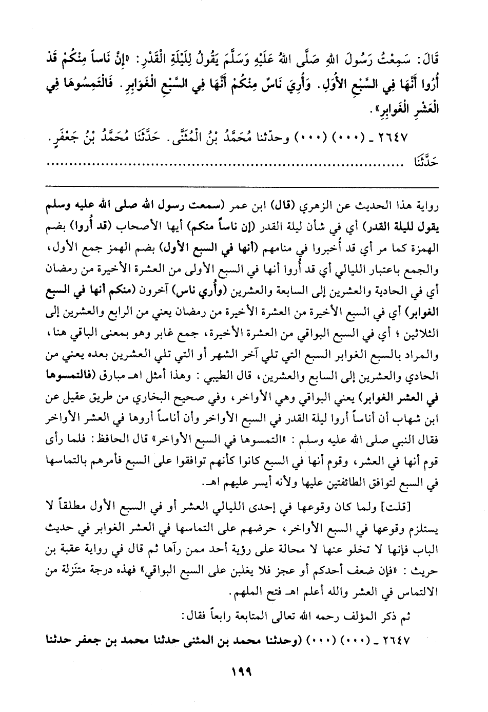 قَال: سَمِعْتُ رَسُولَ اللهِ صَلى اللهُ عَلَيهِ وَسَلمَ يَقُولُ لِلَيلَةِ الْقَدْرِ: "إِن نَاسًا مِنْكُمْ قَدْ أُرُوا أَنَّهَا فِي السبع الأُوَلِ. وَأُرِيَ نَاسٌ مِنْكُمْ أَنهَا فِي السبع الْغَوَابِرِ. فَالتَمِسُوهَا فِي الْعَشْرِ الْغَوابِرِ".