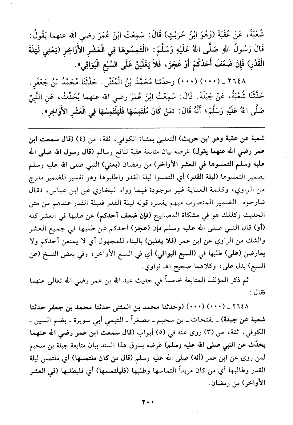 ٢٦٤٨ - (٠٠) (٠٠) (وحدثنا محمد بن المثنى حدثنا محمد بن جعفر حدثنا شعبة عن جبلة) -بفتحات- بن سحيم -مصغرًا- التيمي أبي سويرة -بضم السين- الكوفي، ثقة، من (٣) روى عنه في (٥) أبواب (قال سمعت ابن عمر رضي الله عنهما يحدّث عن النبي صلى الله عليه وسلم) غرضه بسوق هذا السند بيان متابعة جبلة بن سحيم لمن روى عن ابن عمر (أنه) صلى الله عليه وسلم (قال من كان ملتمسها) أي ملتمس ليلة القدر وطالبها أي من كان مريدا التماسها وطلبها (فليلتمسها) أي فليطلبها (في العشر الأواخر) من رمضان.
