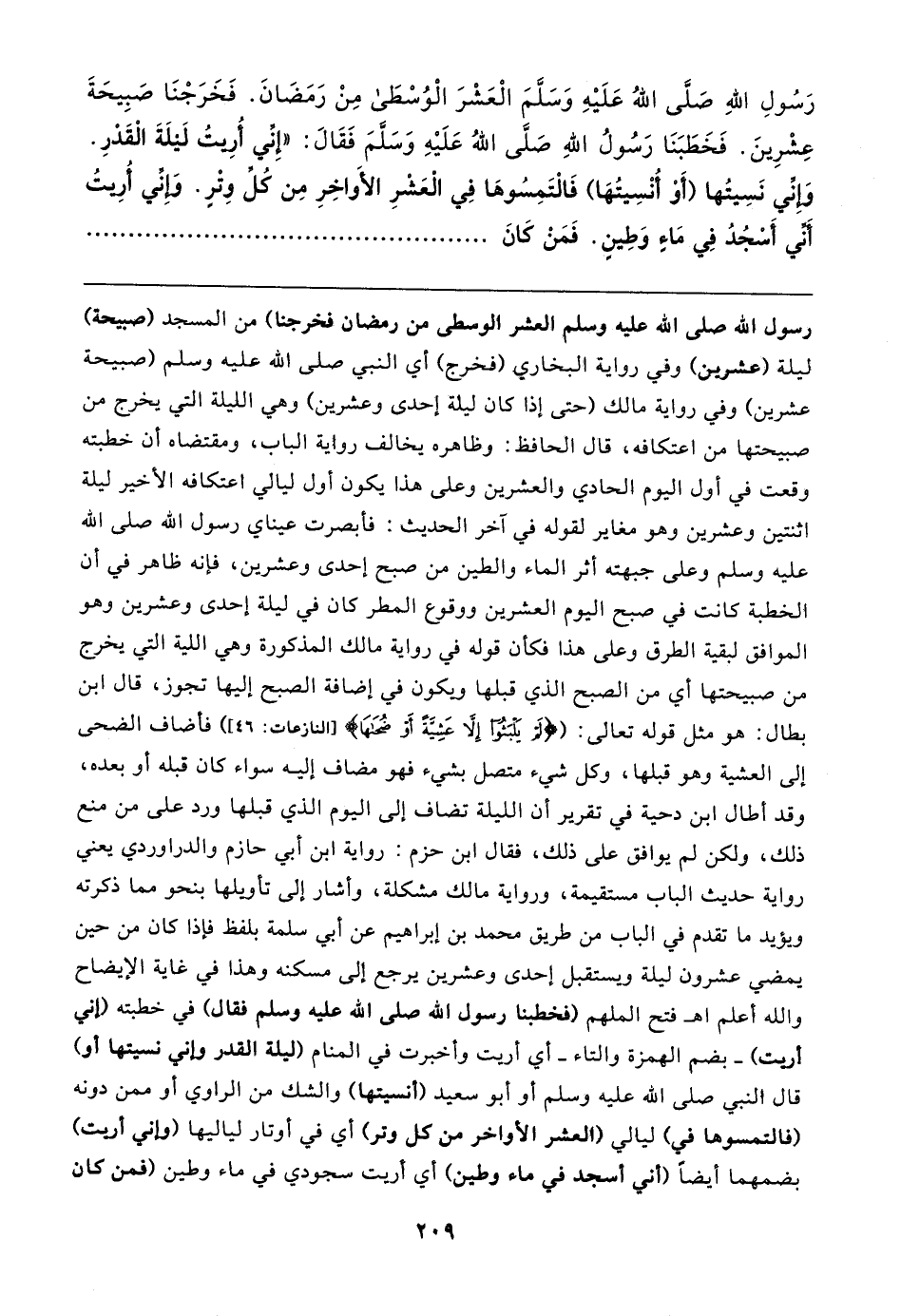 رَسُولِ اللهِ صَلَى اللهُ عَلَيهِ وَسَلمَ الْعَشْرَ الْوُسْطَى مِنْ رَمَضَانَ. فَخَرَجْنَا صَبِيحَةَ عِشْرِينَ. فَخَطَبَنَا رَسُولُ اللهِ صَلَّى اللهُ عَلَيهِ وَسَلمَ فَقَال: "إِني أُرِيتُ لَيلَةَ الْقَدْرِ. وَإِنِّي نَسِيتُها (أَوْ أُنْسِيتُهَا) فَالْتَمِسُوهَا فِي الْعَشْرِ الأَواخِرِ مِن كُل وتْرٍ. وَإِني أُرِيتُ أَني أَسْجُدُ فِي مَاءٍ وَطِينٍ. فَمَنْ كَانَ