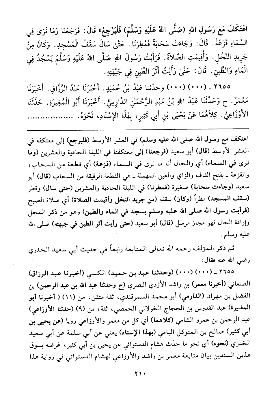 اعْتَكَفَ مَعَ رَسُولِ اللهِ (صَلى اللهُ عَلَيهِ وَسلَّمَ) فَلْيَرْجِعْ" قَال: فَرَجَعْنَا وَمَا نَرَى فِي السمَاءِ قَزَعَةً. قَال: وَجَاءَتْ سَحَابَةٌ فَمُطِرنَا. حَتى سَال سَقْفُ الْمَسْجِدِ. وَكَانَ مِنْ جَرِيدِ النخْلِ. وَأُقِيمَتِ الصلاة. فَرَأيتُ رَسُولَ اللهِ صَلَّى اللهُ عَلَيهِ وَسَلَّمَ يَسْجُدُ فِي الْمَاءِ وَالطِّينِ. قَال: حَتَّى رَأَيتُ أَثَرَ الطِّينِ فِي جَبْهَتِهِ.