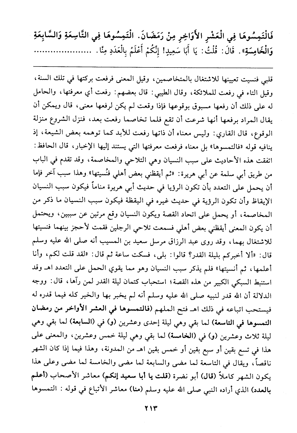 فَالْتَمِسُوهَا فِي الْعَشْرِ الأوَاخِرِ مِنْ رَمَضَانَ. الْتَمِسُوهَا فِي التَّاسِعَةِ وَالسَّابِعَةِ وَالْخَامِسَةِ". قَال: قُلْتُ: يَا أَبَا سَعِيدٍ! إِنَّكُمْ أَعْلَمُ بِالْعَدَدِ مِنَّا