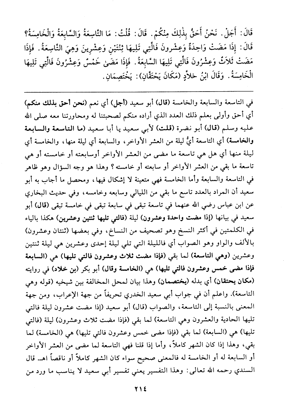 في التاسعة والسابعة والخامسة (قال) أبو سعيد (أجل) أي نعم (نحن أحق بذلك منكم) أي أحق وأولى بعلم ذلك العدد الذي أراده منكم لصحبتنا له ومحاورتنا معه صلى الله عليه وسلم (قال) أبو نضرة (قلت) لأبي سعيد يا أبا سعيد (ما التاسعة والسابعة والخامسة) أي التاسعة أيُّ ليلة من العشر الأواخر، والسابعة أي ليلة منها، والخامسة أي ليلة منها أي هل هي تاسعة ما مضى من العشر الأواخر أو سابعته أو خامسته أو هي تاسعة ما بقي من العشر الأواخر أو سابعته أو خامسته؟ وهذا هو وجه السؤال وهو ظاهر في التاسعة والسابعة وأما الخامسة فهي متعينة لا إشكال فيها، ومحصل ما أجاب به أبو سعيد أن المراد بالعدد تاسع ما بقي من الليالي وسابعه وخامسه، وفي حديث البخاري عن ابن عباس رضي الله عنهما في تاسعة تبقى في سابعة تبقى في خامسة تبقى (قال) أبو سعيد في بيانها (إذا مضت واحدة وعشرون) ليلة (فالتي تليها ثنتين وعشرين) هكذا بالياء في الكلمتين في أكثر النسخ وهو تصحيف من النساخ، وفي بعضها (ثنتان وعشرون) بالألف والواو وهو الصواب أي فالليلة التي تلي ليلة إحدى وعشرين هي ليلة ثنتين وعشرين (وهي التاسعة) لما بقي (فإذا مضت ثلاث وعشرون فالتي تليها) هي (السابعة فإذا مضى خمس وعشرون فالتي تليها) هي (الخامسة وقال) أبو بكر (بن خلاد) في روايته (مكان يحتقان) أي بدله (يختصمان) وهذا بيان لمحل المخالفة بين شيخيه (قوله وهي التاسعة). واعلم أن في جواب أبي سعيد الخدري تحريفًا من جهة الإعراب، ومن جهة المعنى بالنسبة إلى التاسعة، والصواب (قال) أبو سعيد (إذا مضت عشرون ليلة فالتي تليها الحادية والعشرون وهي التاسعة) لما بقي (فإذا مضت ثلاث وعشرون) ليلة (فالتي تليها) هي (السابعة) لما بقي (فإذا مضى خمس وعشرون فالتي تليها) هي (الخامسة) لما بقي، وهذا إذا كان الشهر كاملا، وأما إذا قلنا فهي التاسعة لما مضى من العشر الأواخر أو السابعة له أو الخامسة له فالمعنى صحيح سواء كان الشهر كاملا أو ناقصًا اهـ. قال السندي رحمه الله تعالى: وهذا التفسير يعني تفسير أبي سعيد لا يناسب ما ورد من