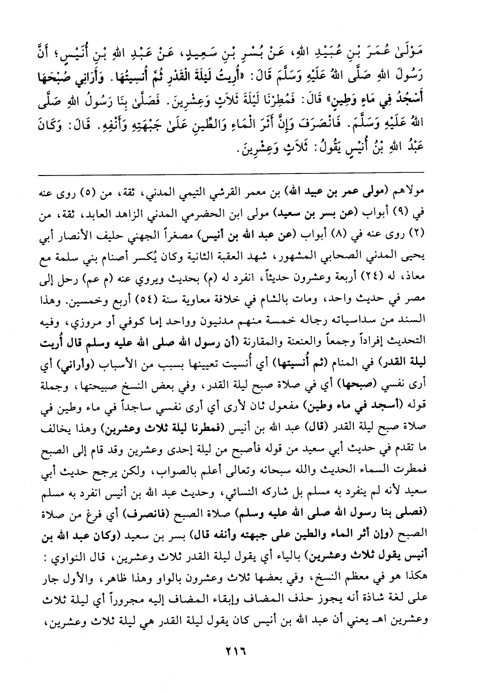 مولاهم (مولى عمر بن عبيد الله) بن معمر القرشي التيمي المدني، ثقة، من (٥) روى عنه في (٩) أبواب (عن بسر بن سعيد) مولى ابن الحضرمي المدني الزاهد العابد، ثقة، من (٢) روى عنه في (٨) أبواب (عن عبد الله بن أنيس) مصغرًا الجهني حليف الأنصار أبي يحيى المدني الصحابي المشهور، شهد العقبة الثانية وكان يُكسر أصنام بني سلمة مع معاذ، له (٢٤) أربعة وعشرون حديثًا، انفرد له (م) بحديث ويروي عنه (م عم) رحل إلى مصر في حديث واحد، ومات بالشام في خلافة معاوية سنة (٥٤) أربع وخمسين. وهذا السند من سداسياته رجاله خمسة منهم مدنيون وواحد إما كوفي أو مروزي، وفيه التحديث إفرادًا وجمعًا والعنعنة والمقارنة (أن رسول الله صلى الله عليه وسلم قال أُريت ليلة القدر) في المنام (ثم أُنسيتها) أي أُنسيت تعيينها بسبب من الأسباب (وأراني) أي أرى نفسي (صبحها) أي في صلاة صبح ليلة القدر، وفي بعض النسخ صبيحتها، وجملة قوله (أسجد في ماء وطين) مفعول ثان لأرى أي أرى نفسي ساجدا في ماء وطين في صلاة صبح ليلة القدر (قال) عبد الله بن أنيس (فمطرنا ليلة ثلاث وعشرين) وهذا يخالف ما تقدم في حديث أبي سعيد من قوله فاصبح من ليلة إحدى وعشرين وقد قام إلى الصبح فمطرت السماء الحديث والله سبحانه وتعالى أعلم بالصواب، ولكن يرجح حديث أبي سعيد لأنه لم ينفرد به مسلم بل شاركه النسائي، وحديث عبد الله بن أنيس انفرد به مسلم (فصلى بنا رسول الله صلى الله عليه وسلم) صلاة الصبح (فانصرف) أي فرغ من صلاة الصبح (وإن أثر الماء والطين على جبهته وأنفه قال) بسر بن سعيد (وكان عبد الله بن أنيس يقول ثلاث وعشرين) بالياء أي يقول ليلة القدر ثلاث وعشرين، قال النواوي: هكذا هو في معظم النسخ، وفي بعضها ثلاث وعشرون بالواو وهذا ظاهر، والأول جار على لغة شاذة أنه يجوز حذف المضاف وإبقاء المضاف إليه مجرورًا أي ليلة ثلاث وعشرين اهـ يعني أن عبد الله بن أنيس كان يقول ليلة القدر هي ليلة ثلاث وعشرين،