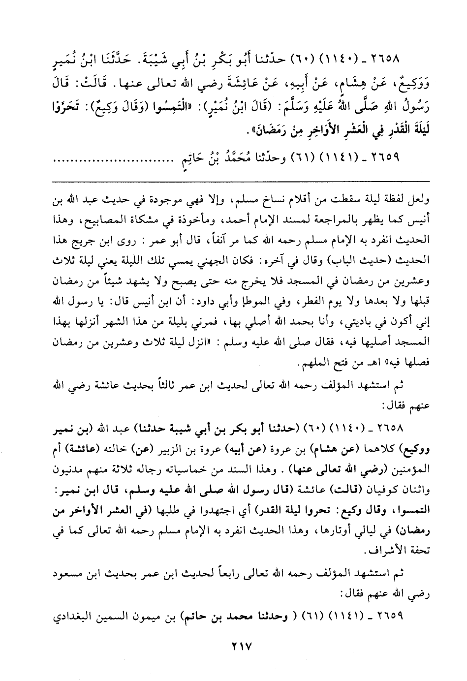 ٢٦٥٨ - (١١٤٠) (٦٠) (حدثنا أبو بكر بن أبي شيبة حدثنا) عبد الله (بن نمير ووكيع) كلاهما (عن هشام) بن عروة (عن أبيه) عروة بن الزبير (عن) خالته (عائشة) أم المؤمنين (رضي الله تعالى عنها). وهذا السند من خماسياته رجاله ثلاثة منهم مدنيون واثنان كوفيان (قالت) عائشة (قال رسول الله صلى الله عليه وسلم، قال ابن نمير: التمسوا، وقال وكبع: تحروا ليلة القدر) أي اجتهدوا في طلبها (في العشر الأواخر من رمضان) في ليالي أوتارها، وهذا الحديث انفرد به الإمام مسلم رحمه الله تعالى كما في تحفة الأشراف.