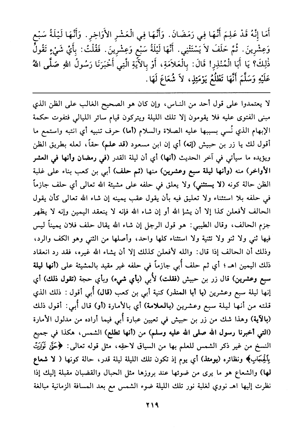 أَمَا إِنَّهُ قَدْ عَلِمَ أَنهَا فِي رَمَضَانَ. وَأَنهَا فِي الْعَشْرِ الأَوَاخِرِ. وَأَنهَا لَيلَةُ سَبْع وَعِشْرِينَ. ثُم حَلَفَ لَا يَسْتَثْنِي. أَنَّهَا لَيلَةُ سَبْع وَعِشْرِينَ. فَقُلْتُ: بِأيِّ شَيءٍ تَقُول ذلِكَ؟ يَا أَبَا الْمُنْذِرِ! قَال: بِالْعَلامَةِ، أَوْ بِالآيَةِ التِي أَخْبَرَنَا رَسُولُ اللهِ صَلى اللهُ عَلَيهِ وَسَلَّمَ أَنهَا تَطْلُعُ يَوْمَئِذٍ، لَا شُعَاعَ لَهَا