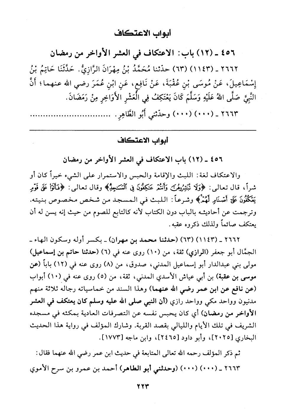 ٢٦٦٢ - (١١٤٣) (٦٣) (حدثنا محمد بن مهران) -بكسر أوله وسكون الهاء- الجمال أبو جعفر (الرازي) ثقة، من (١٠) روى عنه في (٦) (حدثنا حاتم بن إسماعيل) مولى بني عبد الدار أبو إسماعيل المدني، صدوق، من (٨) روى عنه في (١٢) بابا (عن موسى بن عقبة) بن أبي عياش الأسدي المدني، ثقة، من (٥) روى عنه في (١٠) أبواب (عن نافع عن ابن عمر رضي الله عنهما) وهذا السند من خماسياته رجاله ثلاثة منهم مدنيون وواحد مكي وواحد رازي (أن النبي صلى الله عليه وسلم كان يعتكف في العشر الأواخر من رمضان) أي كان يحبس نفسه عن التصرفات العادية بمكثه في مسجده الشريف في تلك الأيام والليالي بقصد القربة. وشارك المؤلف في رواية هذا الحديث البخاري [٢٠٢٥]، وأبو داود [٢٤٦٥]، وابن ماجه [١٧٧٣].