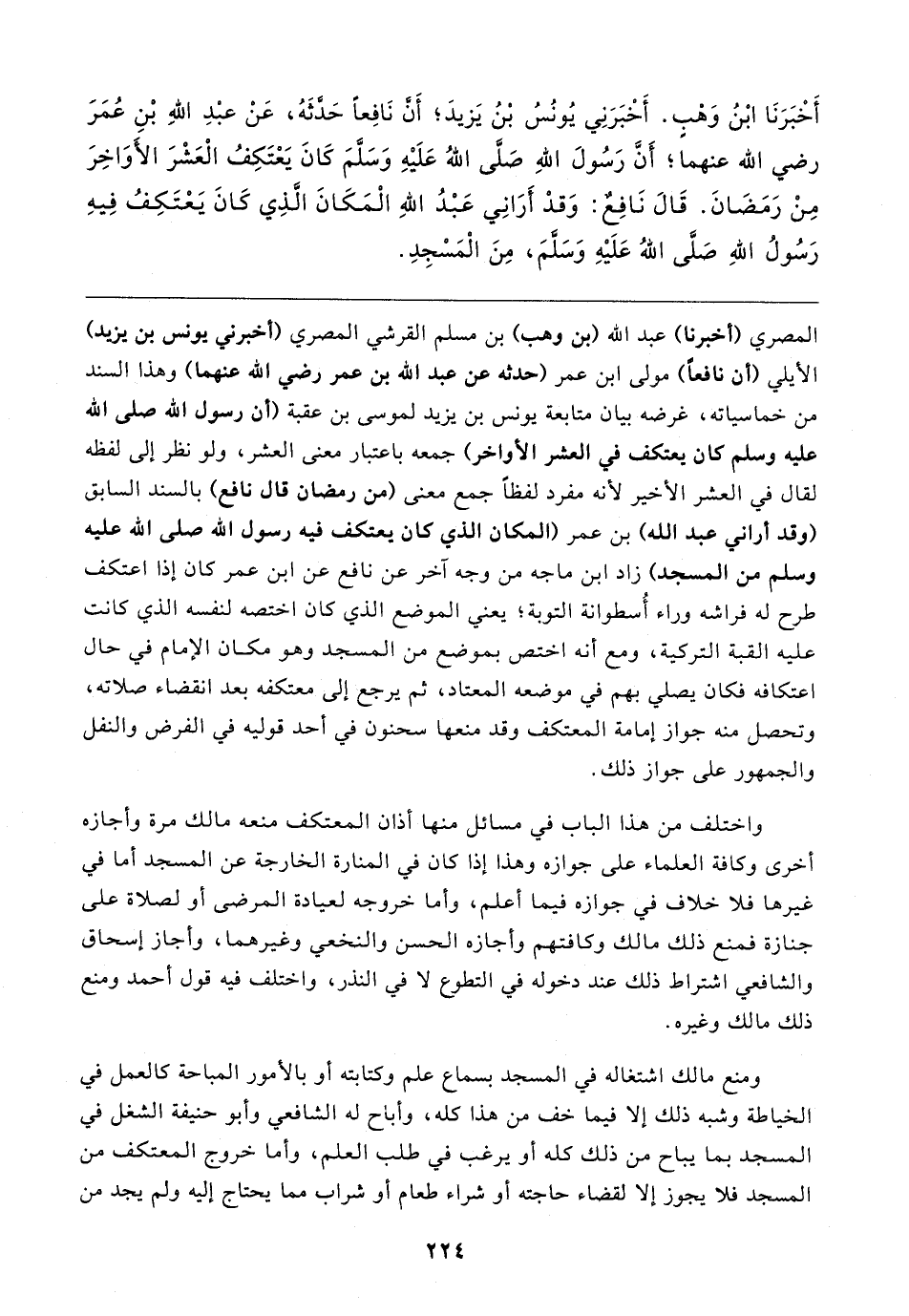 أَخْبَرَنَا ابْنُ وَهْبٍ. أَخْبَرَنِي يُونُسُ بْنُ يَزيدَ؛ أَن نَافِعًا حَدثَهُ، عَنْ عبْدِ اللهِ بْنِ عُمَرَ رضي الله عنهما؛ أَنَّ رَسُولَ اللهِ صَلَّى اللهُ عَلَيهِ وَسَلَّمَ كَانَ يَعْتَكِفُ الْعَشْرَ الأَوَاخِرَ مِنْ رَمَضَانَ. قَال نَافِعٌ: وَقدْ أَرَانِي عَبْدُ اللهِ الْمَكَانَ الَّذِي كَانَ يَعْتَكِفُ فِيهِ رَسُولُ اللهِ صَلَّى اللهُ عَلَيهِ وسلم، مِنَ الْمَسْجِدِ
