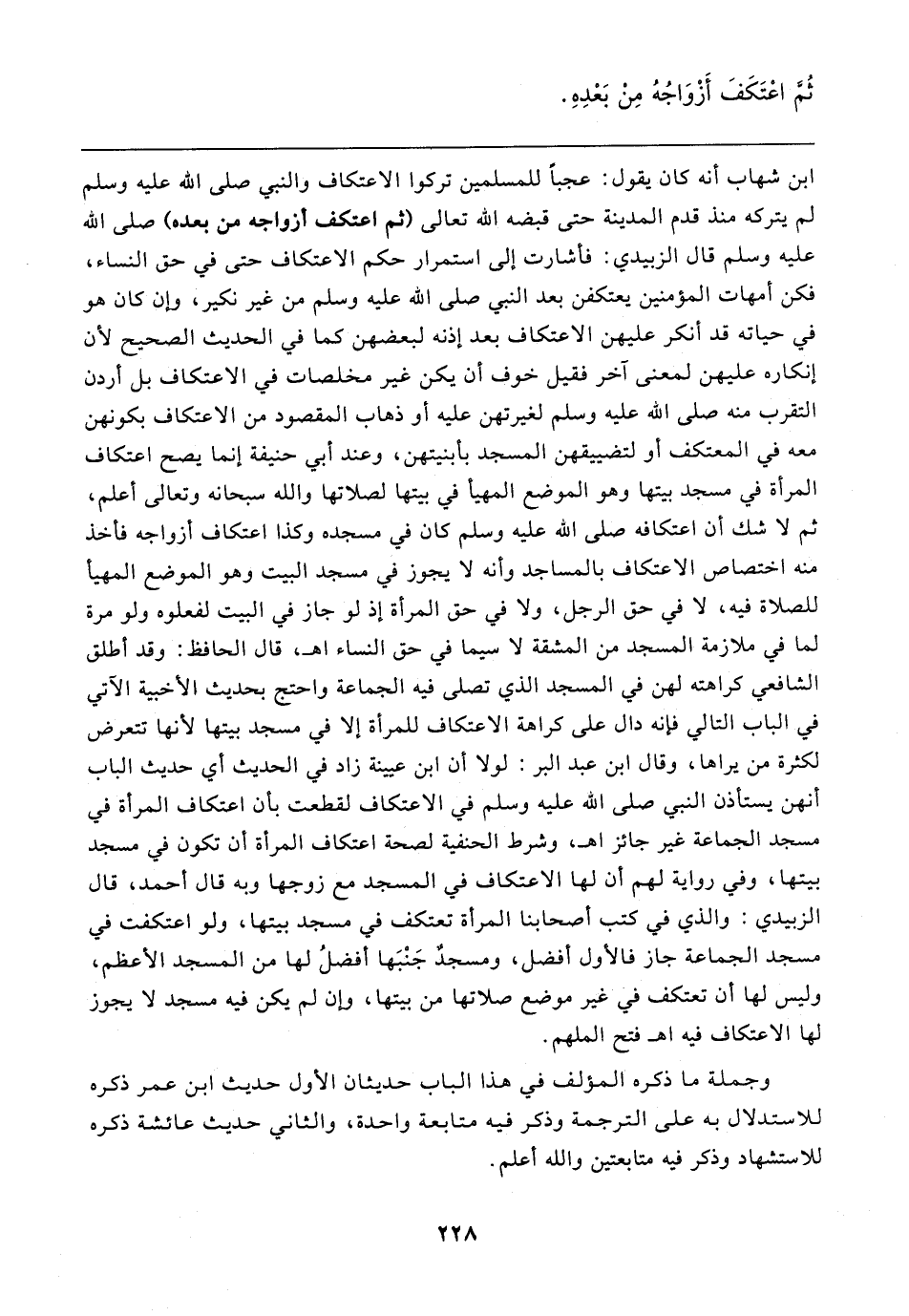 ابن شهاب أنه كان يقول: عجبًا للمسلمين تركوا الاعتكاف والنبي صلى الله عليه وسلم لم يتركه منذ قدم المدينة حتى قبضه الله تعالى (ثم اعتكف أزواجه من بعده) صلى الله عليه وسلم قال الزبيدي: فأشارت إلى استمرار حكم الاعتكاف حتى في حق النساء، فكن أمهات المؤمنين يعتكفن بعد النبي صلى الله عليه وسلم من غير نكير، وإن كان هو في حياته قد أنكر عليهن الاعتكاف بعد إذنه لبعضهن كما في الحديث الصحيح لأن إنكاره عليهن لمعنى آخر فقيل خوف أن يكن غير مخلصات في الاعتكاف بل أردن التقرب منه صلى الله عليه وسلم لغيرتهن عليه أو ذهاب المقصود من الاعتكاف بكونهن معه في المعتكف أو لتضييقهن المسجد بابنيتهن، وعند أبي حنيفة إنما يصح اعتكاف المرأة في مسجد بيتها وهو الموضع المهيأ في بيتها لصلاتها والله سبحانه وتعالى أعلم، ثم لا شك أن اعتكافه صلى الله عليه وسلم كان في مسجده وكذا اعتكاف أزواجه فأخذ منه اختصاص الاعتكاف بالمساجد وأنه لا يجوز في مسجد البيت وهو الموضع المهيأ للصلاة فيه، لا في حق الرجل، ولا في حق المرأة إذ لو جاز في البيت لفعلوه ولو مرة لما في ملازمة المسجد من المشقة لا سيما في حق النساء اهـ، قال الحافظ: وقد أطلق الشافعي كراهته لهن في المسجد الذي تصلى فيه الجماعة واحتج بحديث الأخبية الآتي في الباب التالي فإنه دال على كراهة الاعتكاف للمرأة إلا في مسجد بيتها لأنها تتعرض لكثرة من يراها، وقال ابن عبد البر: لولا أن ابن عيينة زاد في الحديث أي حديث الباب أنهن يستأذن النبي صلى الله عليه وسلم في الاعتكاف لقطعت بأن اعتكاف المرأة في مسجد الجماعة غير جائز اهـ، وشرط الحنفية لصحة اعتكاف المرأة أن تكون في مسجد بيتها، وفي رواية لهم أن لها الاعتكاف في المسجد مع زوجها وبه قال أحمد، قال الزبيدي: والذي في كتب أصحابنا المرأة تعتكف في مسجد بيتها، ولو اعتكفت في مسجد الجماعة جاز فالأول أفضل، ومسجدٌ جَنْبَها أفضلُ لها من المسجد الأعظم، وليس لها أن تعتكف في غير موضع صلاتها من بيتها، وإن لم يكن فيه مسجد لا يجوز لها الاعتكاف فيه اهـ فتح الملهم.