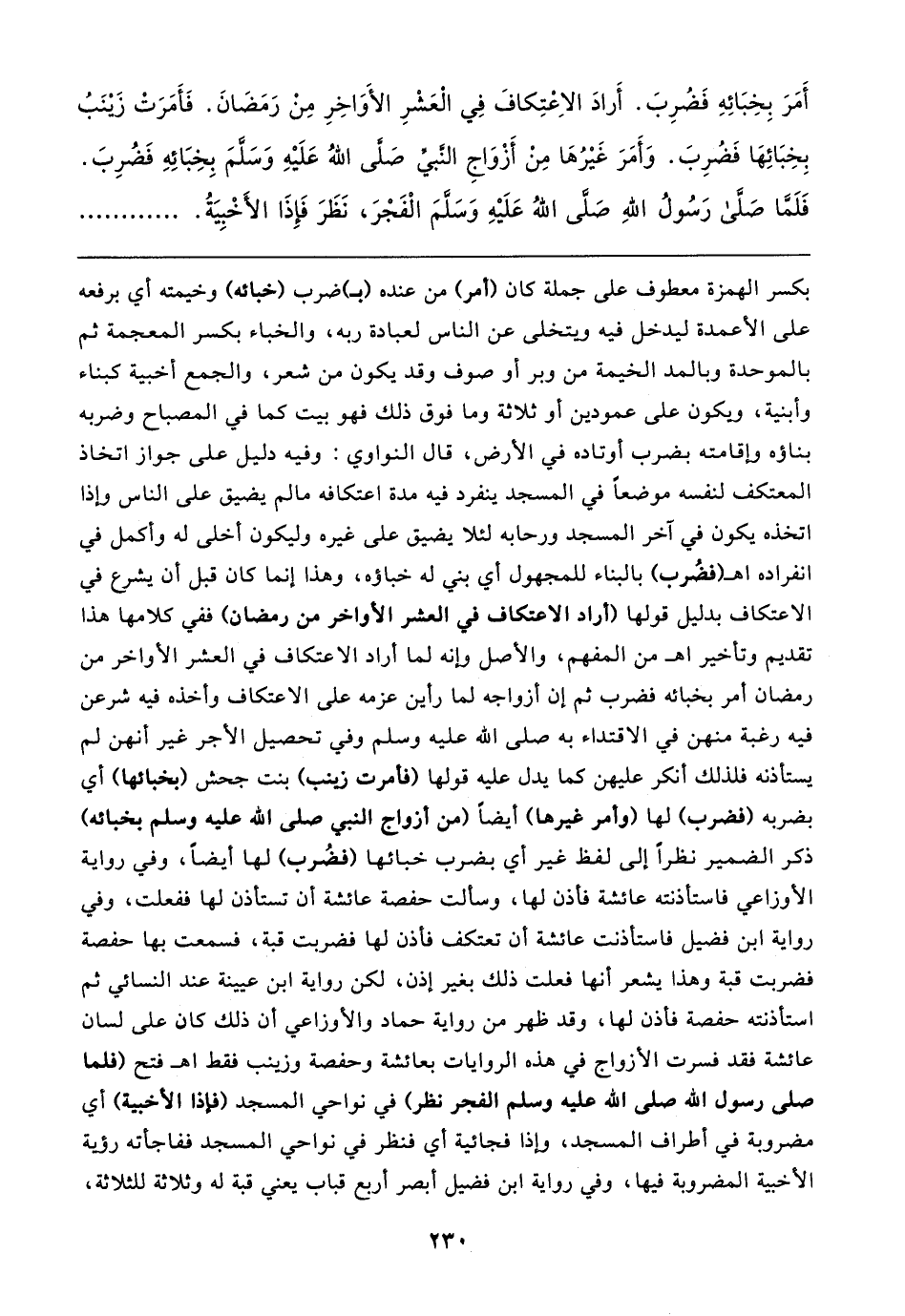 أَمَرَ بِخِبَائهِ فَضُرِبَ. أرادَ الاعْتِكافَ فِي العَشْرِ الأواخِرِ مِنْ رَمَضَانَ. فَأَمَرَتْ زَينَبُ بِخِبَائِهَا فَضُرِبَ. وَأَمَرَ غَيرُهَا مِنْ أَزْوَاجِ النبيِّ صَلى اللهُ عَلَيهِ وَسَلمَ بِخِبَائِهِ فَضُرِبَ. فَلَمَّا صَلَّى رَسُولُ اللهِ صَلى اللهُ عَلَيهِ وسلم الْفَجْرَ، نَظَرَ فَإِذَا الأَخْبِيَةُ