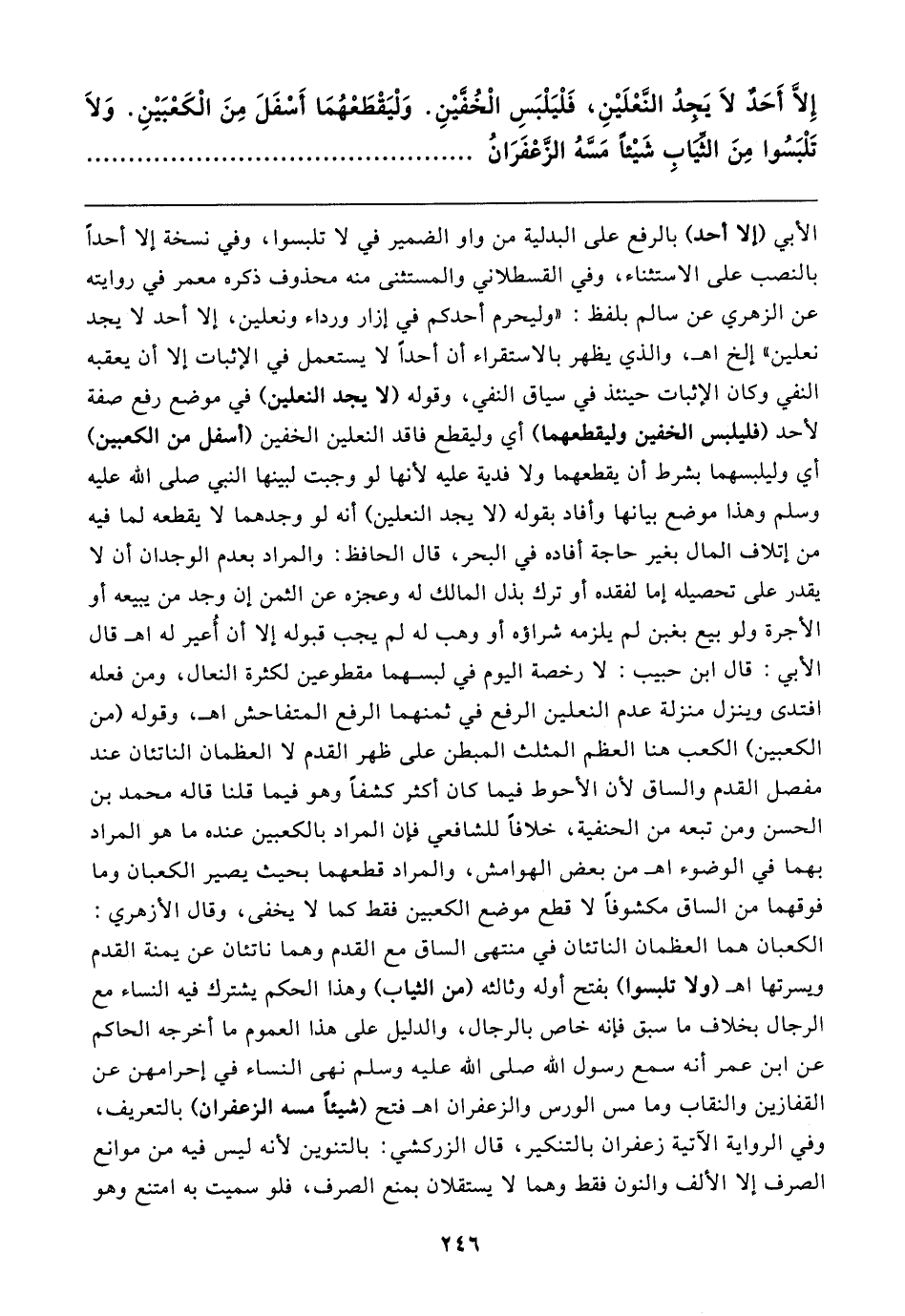 الأبي (إلا أحد) بالرفع على البدلية من واو الضمير في لا تلبسوا، وفي نسخة إلا أحدًا بالنصب على الاستثناء، وفي القسطلاني والمستثنى منه محذوف ذكره معمر في روايته عن الزهري عن سالم بلفظ: "وليحرم أحدكم في إزار ورداء ونعلين، إلا أحد لا يجد نعلين" إلخ اهـ، والذي يظهر بالاستقراء أن أحدًا لا يستعمل في الإثبات إلا أن يعقبه النفي وكان الإثبات حينئذ في سياق النفي، وقوله (لا يجد النعلين) في موضع رفع صفة لأحد (فليلبس الخفين وليقطعهما) أي وليقطع فاقد النعلين الخفين (أسفل من الكعبين) أي وليلبسهما بشرط أن يقطعهما ولا فدية عليه لأنها لو وجبت لبينها النبي صلى الله عليه وسلم وهذا موضع بيانها وأفاد بقوله (لا يجد النعلين) أنه لو وجدهما لا يقطعه لما فيه من إتلاف المال بغير حاجة أفاده في البحر، قال الحافظ: والمراد بعدم الوجدان أن لا يقدر على تحصيله إما لفقده أو ترك بذل المالك له وعجزه عن الثمن إن وجد من يبيعه أو الأجرة ولو بيع بغبن لم يلزمه شراؤه أو وهب له لم يجب قبوله إلا أن أُعير له اهـ قال الأبي: قال ابن حبيب: لا رخصة اليوم في لبسهما مقطوعين لكثرة النعال، ومن فعله افتدى وينزل منزلة عدم النعلين الرفع في ثمنهما الرفع المتفاحش اهـ، وقوله (من الكعبين) الكعب هنا العظم المثلث المبطن على ظهر القدم لا العظمان الناتئان عند مفصل القدم والساق لأن الأحوط فيما كان أكثر كشفًا وهو فيما قلنا قاله محمد بن الحسن ومن تبعه من الحنفية، خلافًا للشافعي فإن المراد بالكعبين عنده ما هو المراد بهما في الوضوء اهـ من بعض الهوامش، والمراد قطعهما بحيث يصير الكعبان وما فوقهما من الساق مكشوفًا لا قطع موضع الكعبين فقط كما لا يخفى، وقال الأزهري: الكعبان هما العظمان الناتئان في منتهى الساق مع القدم وهما ناتئان عن يمنة القدم ويسرتها اهـ (ولا تلبسوا) بفتح أوله وثالثه (من الثياب) وهذا الحكم يشترك فيه النساء مع الرجال بخلاف ما سبق فإنه خاص بالرجال، والدليل على هذا العموم ما أخرجه الحاكم عن ابن عمر أنه سمع رسول الله صلى الله عليه وسأنهى النساء في إحرامهن عن القفازين والنقاب وما مس الورس والزعفران اهـ فتح (شيئًا مسه الزعفران) بالتعريف، وفي الرواية الآتية زعفران بالتنكير، قال الزركشي: بالتنوين لأنه ليس فيه من موانع الصرف إلا الألف والنون فقط وهما لا يستقلان بمنع الصرف، فلو سميت به امتنع وهو