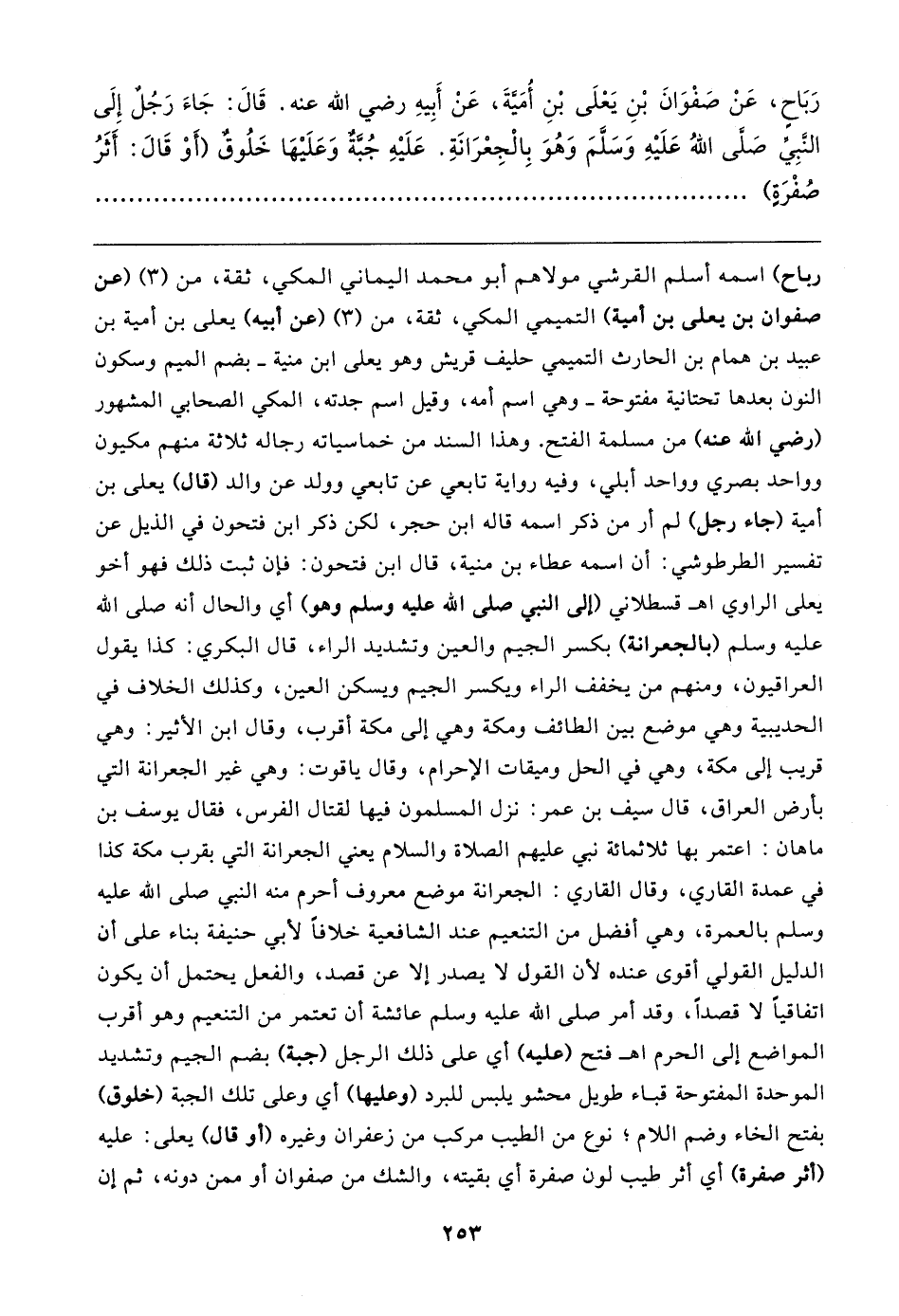 رَبَاحٍ، عَنْ صَفْوَانَ بْنِ يَعْلَى بْنِ أُمَيةَ، عَنْ أَبِيهِ رضي الله عنه. قَال: جَاءَ رَجُلٌ إِلَى النَّبِيّ صَلى اللهُ عَلَيهِ وَسَلَّمَ وَهُوَ بِالْجِعْرَانَةِ. عَلَيهِ جُبَّةٌ وَعَلَيهَا خَلُوقٌ (أَوْ قَال: أَثَرُ صُفْرَةٍ)