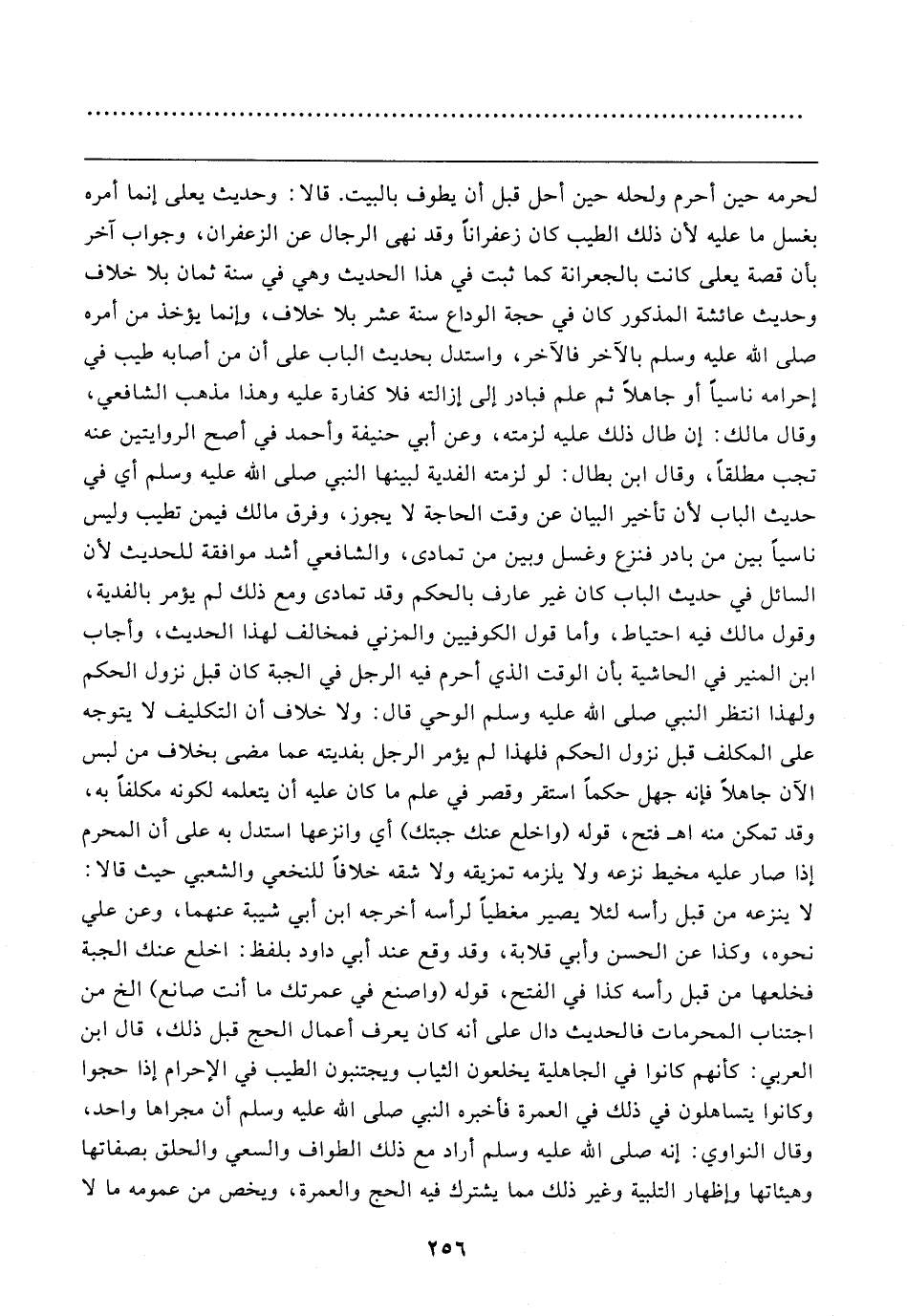 لحرمه حين أحرم ولحله حين أحل قبل أن يطوف بالبيت. قالا: وحديث يعلى إنما أمره بغسل ما عليه لأن ذلك الطيب كان زعفرانًا وقد نهى الرجال عن الزعفران، وجواب آخر بأن قصة يعلى كانت بالجعرانة كما ثبت في هذا الحديث وهي في سنة ثمان بلا خلاف وحديث عائشة المذكور كان في حجة الوداع سنة عشر بلا خلاف، وإنما يؤخذ من أمره صلى الله عليه وسلم بالآخر فالآخر، واستدل بحديث الباب على أن من أصابه طيب في إحرامه ناسيًا أو جاهلًا ثم علم فبادر إلى إزالته فلا كفارة عليه وهذا مذهب الشافعي، وقال مالك: إن طال ذلك عليه لزمته، وعن أبي حنيفة وأحمد في أصح الروايتين عنه تجب مطلقًا، وقال ابن بطال: لو لزمته الفدية لبينها النبي صلى الله عليه وسلم أي في حديث الباب لأن تأخير البيان عن وقت الحاجة لا يجوز، وفرق مالك فيمن تطيب وليس ناسيًا بين من بادر فنزع وغسل وبين من تمادى، والشافعي أشد موافقة للحديث لأن السائل في حديث الباب كان غير عارف بالحكم وقد تمادى ومع ذلك لم يؤمر بالفدية، وقول مالك فيه احتياط، وأما قول الكوفيين والمزني فمخالف لهذا الحديث، وأجاب ابن المنير في الحاشية بان الوقت الذي أحرم فيه الرجل في الجبة كان قبل نزول الحكم ولهذا انتظر النبي صلى الله عليه وسلم الوحي قال: ولا خلاف أن التكليف لا يتوجه على المكلف قبل نزول الحكم فلهذا لم يؤمر الرجل بفديته عما مضى بخلاف من لبس الًان جاهلًا فإنه جهل حكمًا استقر وقصر في علم ما كان عليه أن يتعلمه لكونه مكلفًا به، وقد تمكن منه اهـ فتح، قوله (واخلع عنك جبتك) أي وانزعها استدل به على أن المحرم إذا صار عليه مخيط نزعه ولا يلزمه تمزيقه ولا شقه خلافًا للنخعي والشعبي حيث قالا: لا ينزعه من قبل رأسه لئلا يصير مغطيًا لرأسه أخرجه ابن أبي شيبة عنهما، وعن علي نحوه، وكذا عن الحسن وأبي قلابة، وقد وقع عند أبي داود بلفظ: اخلع عنك الجبة فخلعها من قبل رأسه كذا في الفتح، قوله (واصنع في عمرتك ما أنت صانع) الخ من اجتناب المحرمات فالحديث دال على أنه كان يعرف أعمال الحج قبل ذلك، قال ابن العربي: كأنهم كانوا في الجاهلية يخلعون الثياب ويجتنبون الطيب في الإحرام إذا حجوا وكانوا يتساهلون في ذلك في العمرة فأخبره النبي صلى الله عليه وسلم أن مجراها واحد، وقال النواوي: إنه صلى الله عليه وسلم أراد مع ذلك الطواف والسعي والحلق بصفاتها وهيئاتها وإظهار التلبية وغير ذلك مما يشترك فيه الحج والعمرة، ويخص من عمومه ما لا