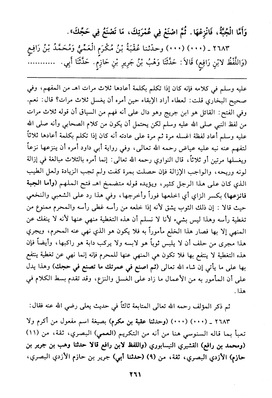 عليه وسلم في كلامه فإنه كان إذا تكلم بكلمة أعادها ثلاث مرات اهـ من المفهم، وفي صحيح البخاري قلت: لعطاء أراد الإبقاء حين أمره أن يغسل ثلاث مرات؟ قال: نعم. وفي الفتح: القائل هو ابن جريج وهو دال على أنه فهم من السياق أن قوله ثلاث مرات من لفظ النبي صلى الله عليه وسلم لكن يحتمل أن يكون من كلام الصحابي وأنه صلى الله عليه وسلم أعاد لفظة اغسله مرة ثم مرة على عادته أنه كان إذا تكلم بكلمة أعادها ثلاثًا لتفهم عنه نبه عليه عياض رحمه الله تعالى، وفي رواية أبي داود أمره أن ينزعها نزعًا ويغسلها مرتين أو ثلاثًا، قال النواوي رحمه الله تعالى: إنما أمره بالثلاث مبالغة في إزالة لونه وريحه، والواجب الإزالة فإن حصلت بمرة كفت ولم تجب الزيادة ولعل الطيب الذي كان على هذا الرجل كثير، ويؤيده قوله متضمخ اهـ فتح الملهم (وأما الجبة فانزعها) بكسر الزاي أي اخلعها فورًا وأخرجها، وفي هذا رد على الشعبي والنخعي حيث قالا: إن ذلك الثوب يشق لأنه إذا خلعه من رأسه غطى رأسه والمحرم ممنوع من تغطية رأسه وهذا ليس بشيء لأنا لا نسلم أن هذه التغطية منهي عنها لأنه لا ينفك عن المنهي إلا بها فصار هذا الخلع مأمورًا به فلا يكون هو الذي نهي عنه المحرم، ويجري هذا مجرى من حلف أن لا يلبس ثوبًا هو لابسه ولا يركب دابة هو راكبها، وأيضًا فإن هذه التغطية لا ينتفع بها فلا تكون هي المنهي عنها للمحرم فأنه إنما نهي عن تغطية ينتفع بها على ما يأتي إن شاء الله تعالى (ثم اصنع في عمرتك ما تصنع في حجك) وهذا يدل على أن المأمور به من الأعمال ما زاد على الغسل والنزع، وقد تقدم بسط الكلام في هذا.