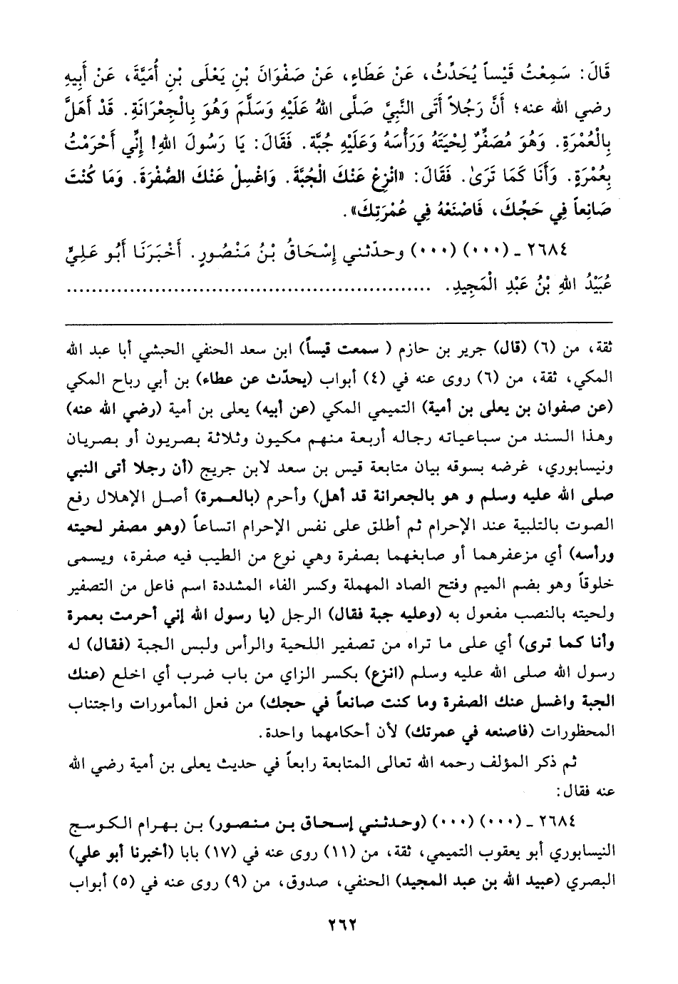 قَال: سَمِعْتُ قَيسًا يُحَدِّثُ، عَنْ عَطَاءٍ، عَنْ صَفْوَانَ بْنِ يَعلَى بْنِ أميةَ، عَنْ أَبِيهِ رضي الله عنه؛ أن رَجُلًا أَتَى النبي صَلى الله عَلَيهِ وَسَلَّمَ وَهوَ بِالْجِعْرَانَةِ. قَدْ أَهَلَّ بِالْعُمْرَةِ. وَهُوَ مُصَفِّرٌ لِحْيَتَهُ وَرَأسَهُ وَعَلَيهِ جُبَّة. فَقَال: يَا رَسُولَ الله! إِنِّي أَحْرَمْتُ بِعُمْرَةٍ. وَأَنَا كَمَا تَرَى. فَقَال: "انْزِعْ عَنْكَ الْجُبَّةَ. وَاغسِلْ عَنْكَ الصُّفرَةَ. وَمَا كُنتَ صَانِعًا فِي حَجِّكَ، فَاصْنَعْهُ فِي عُمْرَتِكَ".