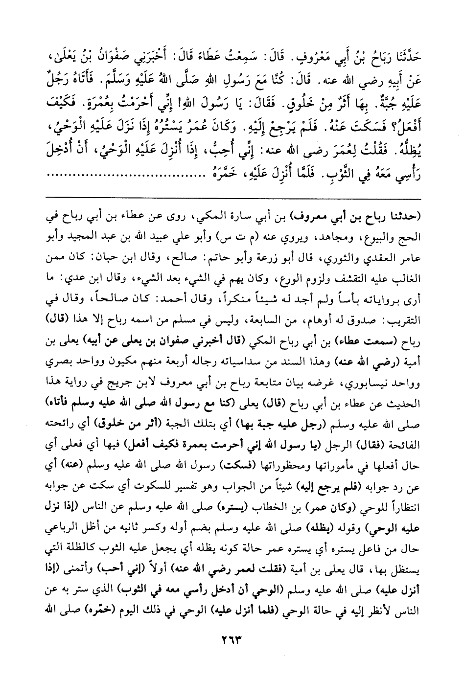 حَدَّثَنَا رَبَاحُ بْنُ أَبِي مَعْرُوفٍ. قَال: سَمِعْتُ عَطَاءً قَال: أَخْبَرَنِي صَفْوَانُ بْنُ يَعْلَى، عَنْ أَبِيهِ رضي الله عنه. قَال: كُنا مَعَ رَسُولِ اللهِ صَلَّى اللهُ عَلَيهِ وَسَلَّمَ. فَأتَاهُ رَجُلٌ عَلَيهِ جُبَّةٌ. بِهَا أَثَرٌ مِنْ خَلُوقٍ. فَقَال: يَا رَسُولَ اللهِ! إِني أَحْرَمْتُ بِعُمْرَةٍ. فَكَيفَ أَفْعَلُ؟ فَسَكَتَ عَنْهُ. فَلَمْ يَرْجِعْ إِلَيهِ. وَكَانَ عُمَرُ يَسْتُرُهُ إِذَا نَزَلَ عَلَيهِ الْوَحْيُ، يُظِلُّهُ. فَقُلْتُ لِعُمَرَ رضي الله عنه: إِني أحِبُّ، إِذَا أُنْزِلَ عَلَيهِ الْوَحْيُ، أَنْ أدْخِلَ رَأسِي مَعَهُ فِي الثَّوْبِ. فَلَمَّا أُنْزِلَ عَلَيهِ، خَمَّرَهُ