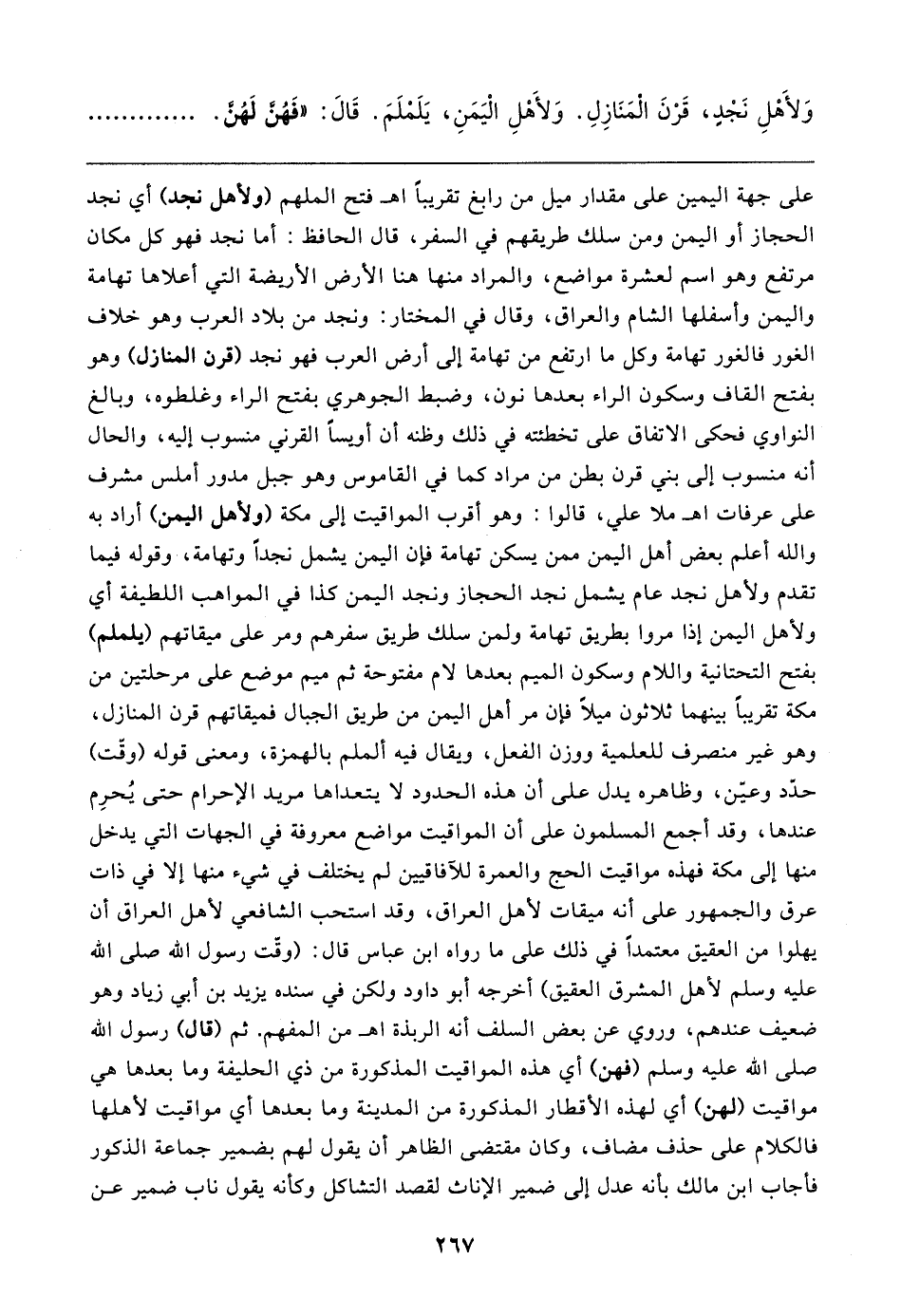 على جهة اليمين على مقدار ميل من رابغ تقريبًا اهـ فتح الملهم (ولأهل نجد) أي نجد الحجاز أو اليمن ومن سلك طريقهم في السفر، قال الحافظ: أما نجد فهو كل مكان مرتفع وهو اسم لعشرة مواضع، والمراد منها هنا الأرض الأريضة التي أعلاها تهامة واليمن وأسفلها الشام والعراق، وقال في المختار: ونجد من بلاد العرب وهو خلاف الغور فالغور تهامة وكل ما ارتفع من تهامة إلى أرض العرب فهو نجد (قرن المنازل) وهو بفتح القاف وسكون الراء بعدها نون، وضبط الجوهري بفتح الراء وغلطوه، وبالغ النواوي فحكى الاتفاق على تخطئته في ذلك وظنه أن أويسًا القرني منسوب إليه، والحال أنه منسوب إلى بني قرن بطن من مراد كما في القاموس وهو جبل مدور أملس مشرف على عرفات اهـ ملا علي، قالوا: وهو أقرب المواقيت إلى مكة (ولأهل اليمن) أراد به والله أعلم بعض أهل اليمن ممن يسكن تهامة فإن اليمن يشمل نجدًا وتهامة، وقوله فيما تقدم ولأهل نجد عام يشمل نجد الحجاز ونجد اليمن كذا في المواهب اللطيفة أي ولأهل اليمن إذا مروا بطريق تهامة ولمن سلك طريق سفرهم ومر على ميقاتهم (يلملم) بفتح التحتانية واللام وسكون الميم بعدها لام مفتوحة ثم ميم موضع على مرحلتين من مكة تقريبًا بينهما ثلاثون ميلًا فإن مر أهل اليمن من طريق الجبال فميقاتهم قرن المنازل، وهو غير منصرف للعلمية ووزن الفعل، ويقال فيه ألملم بالهمزة، ومعنى قوله (وقت) حدد وعين، وظاهره يدل على أن هذه الحدود لا يتعداها مريد الإحرام حتى يُحرِم عندها، وقد أجمع المسلمون على أن المواقيت مواضع معروفة في الجهات التي يدخل منها إلى مكة فهذه مواقيت الحج والعمرة للآفاقيين لم يختلف في شيء منها إلا في ذات عرق والجمهور على أنه ميقات لأهل العراق، وقد استحب الشافعي لأهل العراق أن يهلوا من العقيق معتمدًا في ذلك على ما رواه ابن عباس قال: (وقت رسول الله صلى الله عليه وسلم لأهل المشرق العقيق) أخرجه أبو داود ولكن في سنده يزيد بن أبي زياد وهو ضعيف عندهم، وروي عن بعض السلف أنه الربذة اهـ من المفهم. ثم (قال) رسول الله صلى الله عليه وسلم (فهن) أي هذه المواقيت المذكورة من ذي الحليفة وما بعدها هي مواقيت (لهن) أي لهذه الأقطار المذكورة من المدينة وما بعدها أي مواقيت لأهلها فالكلام على حذف مضاف، وكان مقتضى الظاهر أن يقول لهم بضمير جماعة الذكور فأجاب ابن مالك بأنه عدل إلى ضمير الإناث لقصد التشاكل وكأنه يقول ناب ضمير عن