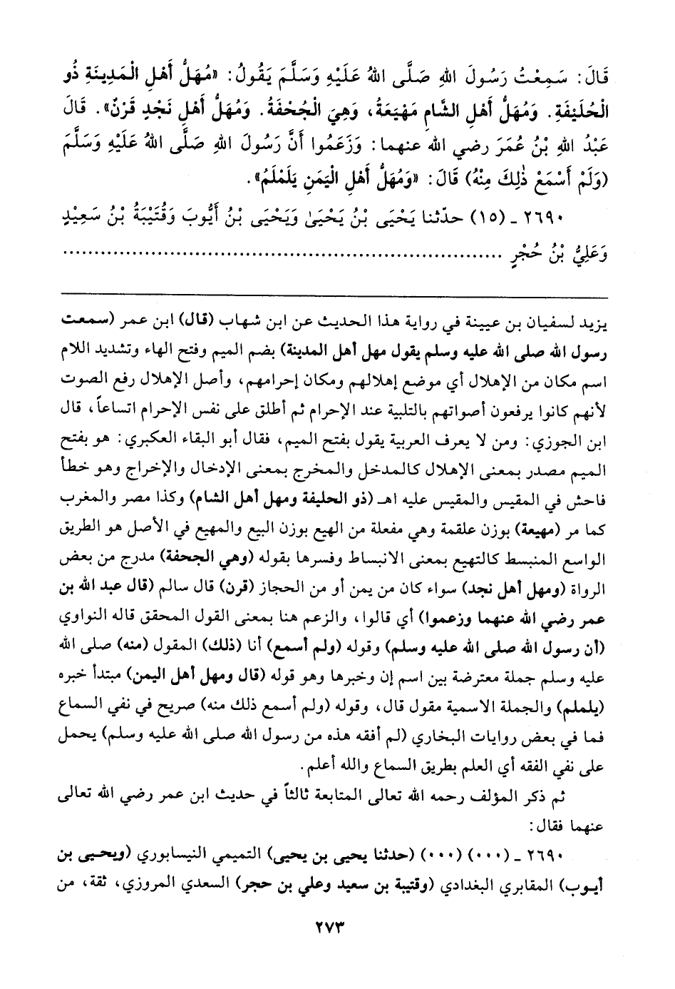 قَال: سَمِعْتُ رَسُولَ اللهِ صَلى اللهُ عَلَيهِ وسلم يَقُولُ: "مُهَلُّ أَهلِ الْمَدِينَةِ ذُو الْحُلَيفَةِ. وَمُهَلُّ أَهْلِ الشامِ مَهْيَعَةُ، وَهِيَ الْجُحْفَةُ. وَمُهَل أَهْل نَجْد قَرْن". قَال عَبْدُ اللهِ بْنُ عُمَرَ رضي الله عنهما: وَزَعَمُوا أَن رَسُولَ اللهِ صَلى اللهُ عَلَيهِ وسلم (وَلَمْ أَسْمَعْ ذلِكَ مِنْهُ) قَال: "وَمُهَل أَهْلِ الْيَمَنِ يَلَمْلَمُ".