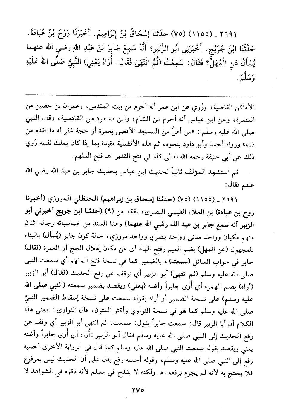 ٢٦٩١ - (١١٥٥) (٧٥) (حدثنا إسحاق بن إبراهيم) الحنظلي المروزي (أخبرنا روح بن عبادة) بن العلاء القيسي البصري، ثقة، من (٩) (حدثنا ابن جريج أخبرني أبو الزبير أنه سمع جابر بن عبد الله رضي الله عنهما) وهذا السند من خماسياته رجاله اثنان منهم مكيان وواحد مدني وواحد بصري وواحد مروزي، حالة كون جابر (يُسأل) بالبناء للمجهول (عن المهل) بضم الميم وفتح الهاء أي عن مكان إهلال الحج أو العمرة (فقال) جابر في جواب السائل (سمعتـ) ـه بالضمير كما في نسخة فتح الملهم أي سمعت النبي صلى الله عليه وسلم (ثم انتهى) أبو الزبير أي توقف عن رفع الحديث (فقال) أبو الزبير (أراه) بضم الهمزة أي أُرى جابرًا وأظنه (يعني) ويقصد بضمير سمعته (النبي صلى الله عليه وسلم) على نسخة الضمير أو أراد بقوله سمعت على نسخة إسقاط الضمير النبيَّ صلى الله عليه وسلم كما هو في نسخة النواوي وأكثر المتون، قال النواوي: معنى هذا الكلام أن أبا الزبير قال: سمعت جابرًا يقول: سمعت، ثم انتهى أبو الزبير أي وقف عن رفع الحديث إلى النبي صلى الله عليه وسلم فقال أبو الزبير: أُراه أي أُرى جابرًا وأظنه يعني ويقصد بقوله سمعت النبي صلى الله عليه وسلم كما قال في الرواية الأخرى أحسبه رفع إلى النبي صلى الله عليه وسلم، وقوله أحسبه رفع يدل على أن الحديث ليس بمرفوع فلا يحتج به لأنه لم يجزم برفعه اهـ ولكنه لا يقدح في مسلم لأنه ذكره في الشواهد لا