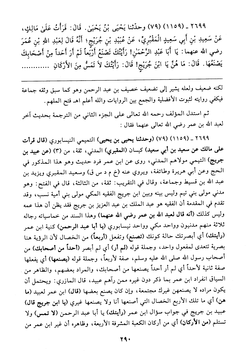 ٢٦٩٩ - (١١٥٩) (٧٩) وحدّثنا يَحْيَى بْنُ يَحْيَى. قَال: قَرَأْتُ عَلَى مَالِكٍ، عَنْ سَعِيدِ بْنِ أَبِي سَعِيدٍ الْمَقْبُرِيِّ، عَنْ عُبَيدِ بْنِ جُرَيجٍ؛ أَنَّهُ قَال لِعَبْدِ اللهِ بْنِ عُمَرَ رضي الله عنهما: يَا أَبَا عَبْدِ الرَّحْمَنِ! رَأَيتُكَ تَصْنَعُ أَرْبَعًا لَمْ أَرَ أَحَدًا مِنْ أَصْحَابِكَ يَصْنَعُهَا. قَال: مَا هُنَّ يَا ابْنَ جُرَيجٍ! قَال: رَأَيتُكَ لَا تَمسُّ مِنَ الأَرْكَانِ