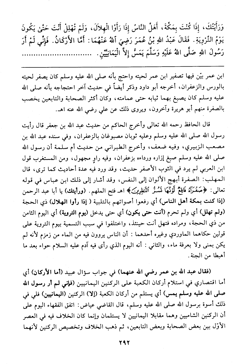 ابن عمر بيّن فيها تصفير ابن عمر لحيته واحتج بأنه صلى الله عليه وسلم كان يصفر لحيته بالورس والزعفران، أخرجه أبو داود وذكر أيضًا في حديث آخر احتجاجه بأنه صلى الله عليه وسلم كان يصبغ بهما ثيابه حتى عمامته، وكان أكثر الصحابة والتابعين يخصب بالصفرة منهم أبو هريرة وآخرون، ويروى ذلك عن علي رضي الله عنه اهـ.