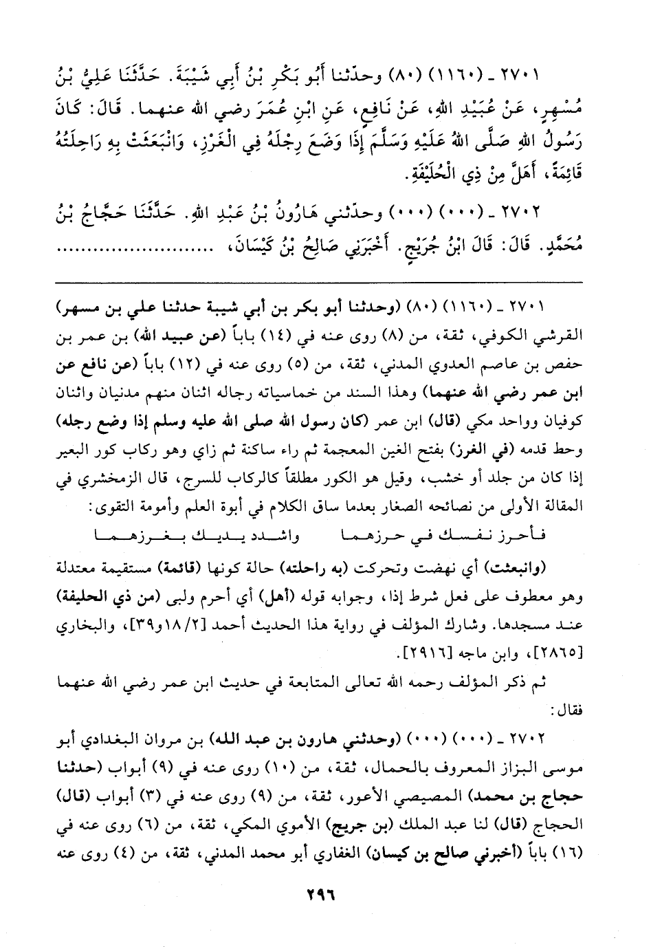 ٢٧٠١ - (١١٦٠) (٨٠) وحدّثنا أَبُو بَكْرِ بْنُ أَبِي شَيبَةَ. حَدَّثَنَا عَلِيُّ بْنُ مُسْهِرٍ، عَنْ عُبَيدِ اللهِ، عَنْ نَافِعٍ، عَنِ ابْنِ عُمَرَ رضي الله عنهما. قَال: كَانَ رَسُولُ اللهِ صَلَّى اللهُ عَلَيهِ وَسَلمَ إِذَا وَضَعَ رِجْلَهُ فِي الْغَرْزِ، وَانْبَعَثَتْ بِهِ رَاحِلَتُهُ قَائِمَةً، أَهَل مِنْ ذِي الْحُلَيفَةِ.