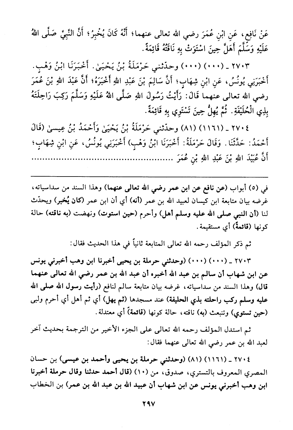 ٢٧٠٣ - (٠٠) (٠٠) (وحدثني حرملة بن يحيى أخبرنا ابن وهب أخبرني يونس عن ابن شهاب أن سالم بن عبد الله أخبره أن عبد الله بن عمر رضي الله تعالى عنهما قال) وهذا السند من سداسياته، غرضه بيان متابعة سالم لنافع (رأيت رسول الله صلى الله عليه وسلم ركب راحلته بذي الحليفة) عند مسجدها (ثم يهل) أي ثم أهل أي أحرم ولبى (حين تستوي) وتنبعث (به) ناقته، حالة كونها (قائمة) أي معتدلة.