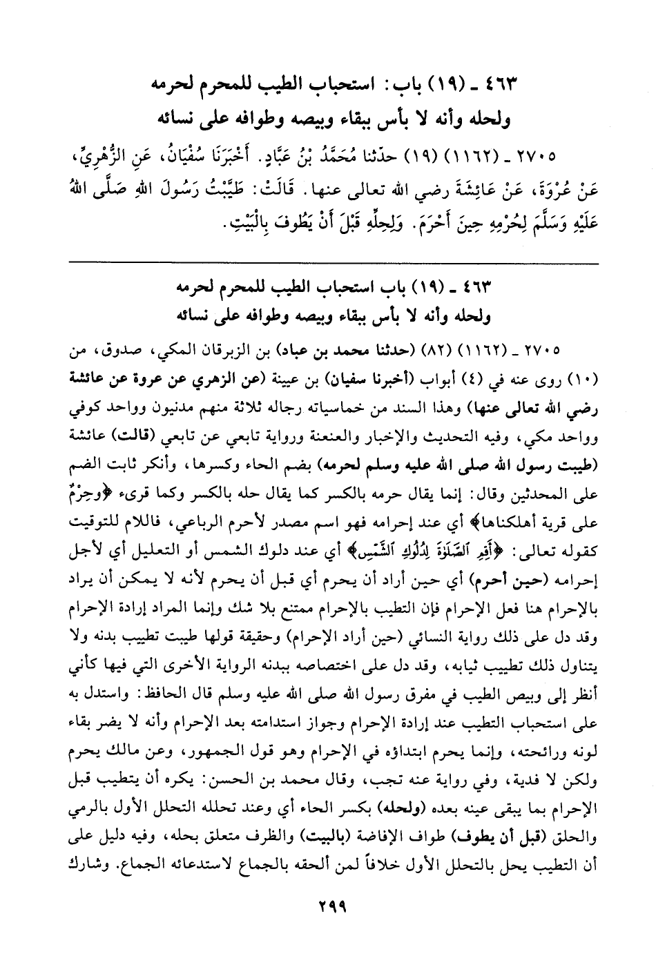 ٤٦٣ - (١٩) باب استحباب الطيب للمحرم لحرمه ولحله وأنه لا بأس ببقاء وبيصه وطوافه على نسائه
