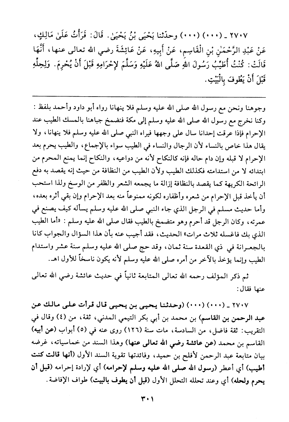 ٢٧٠٧ - (٠٠) (٠٠) (وحدثنا يحيى بن يحيى قال قرأت على مالك عن عبد الرحمن بن القاسم) بن محمد بن أبي بكر التيمي المدني، ثقة، من (٤) وقال في التقريب: ثقة فاضل، من السادسة، مات سنة (١٢٦) روى عنه في (٥) أبواب (عن أبيه) القاسم بن محمد (عن عائشة رضي الله تعالى عنها) وهذا السند من خماسياته، غرضه بيان متابعة عبد الرحمن لأفلح بن حميد، وفائدتها تقوية السند الأول (أنها قالت كنت أطيب) أي أعطر (رسول الله صلى الله عليه وسلم لإحرامه) أي لإرادة إحرامه (قبل أن يحرم ولحله) أي وعند تحلله التحلل الأول (قبل أن يطوف بالبيت) طواف الإفاضة.
