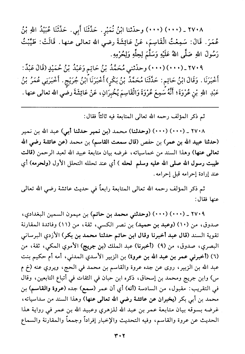 ٢٧٠٩ - (٠٠) (٠٠) (وحدثني محمد بن حاتم) بن ميمون السمين البغدادي، صدوق، من (١٠) (وعبد بن حميد) بن نصر الكسي، ثقة، من (١١) وفائدة المقارنة تقوية السند (قال عبد أخبرنا وقال ابن حاتم حدثنا محمد بن بكر) الأزدي البرساني البصري، صدوق، من (٩) (أخبرنا) عبد الملك (بن جريج) الأموي المكي، ثقة، من (٦) (أخبرني عمر بن عبد الله بن عروة) بن الزبير الأسدي المدني، أمه أم حكيم بنت عبد الله بن الزبير، روى عن جده عروة والقاسم بن محمد في الحج، ويروي عنه (خ م س) وابن جريج ومحمد بن إسحاق، ذكره ابن حبان في الثقات في أتباع التابعين، وقال في التقريب: مقبول، من السادسة (أنه) أي أن عمر (سمع) جده (عروة والقاسم) بن محمد بن أبي بكر (يخبران عن عائشة رضي الله تعالى عنها) وهذا السند من سداسياته، غرضه بسوقه بيان متابعة عمر بن عبد الله للزهري وعبيد الله بن عمر في رواية هذا الحديث عن عروة والقاسم، وفيه التحديث والإخبار إفرادًا وجمعًا والمقارنة والسماع