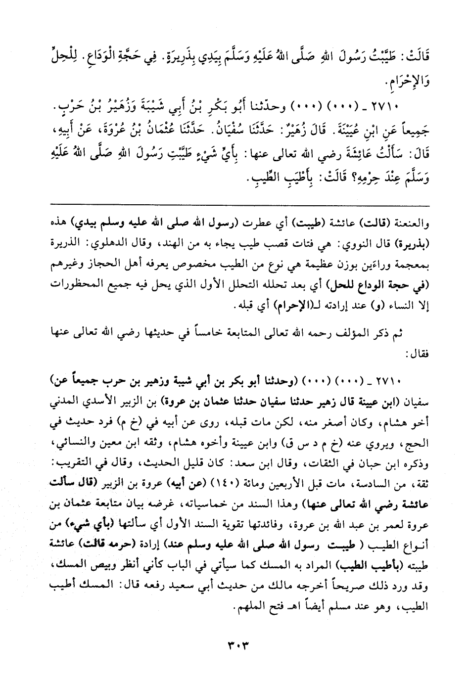 ٢٧١٠ - (٠٠) (٠٠) وحدّثنا أَبُو بَكْرِ بْنُ أبِي شَيبَةَ وَزُهَيرُ بْنُ حَرْبٍ. جَمِيعًا عَنِ ابْنِ عُيَينَةَ. قَال زُهَيرٌ: حَدَّثَنَا سُفْيَانُ. حَدَّثَنَا عُثْمَانُ بْنُ عُرْوَةَ، عَنْ أَبِيهِ، قَال: سَأَلْتُ عَائِشَةَ رضي الله تعالى عنها: بِأَيِّ شَيءٍ طَيَّبْتِ رَسُولَ اللهِ صَلَّى اللهُ عَلَيهِ وَسَلَّمَ عِنْدَ حِرْمِهِ؟ قَالتْ: بِأَطْيَبِ الطِّيبِ