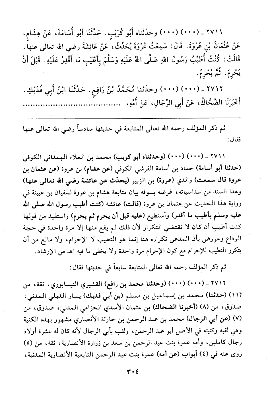 ٢٧١١ - (٠٠) (٠٠) وحدّثناه أَبُو كُرَيبٍ. حَدَّثَنَا أَبُو أُسَامَةَ، عَنْ هِشَامٍ، عَنْ عُثْمَانَ بْنِ عُرْوَةَ. قَال: سَمِعْتُ عُرْوَةَ يُحَدِّثُ، عَنْ عَائِشَةَ رضي الله تعالى عنها. قَالتْ: كُنْتُ أُطَيِّبُ رَسُولَ اللهِ صَلَّى اللهُ عَلَيهِ وَسَلَّمَ بِأَطْيَبِ مَا أقْدِرُ عَلَيهِ. قَبْلَ أَنْ يُحْرِمَ. ثُمَّ يُحْرِمُ.