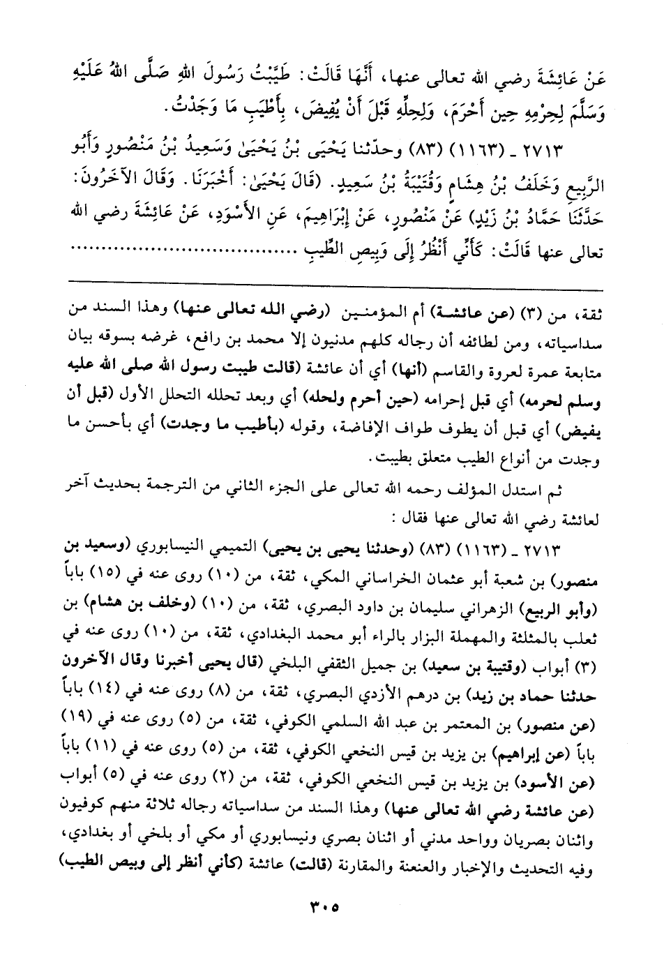 ٢٧١٣ - (١١٦٣) (٨٣) (وحدثنا يحيى بن يحيى) التميمي النيسابوري (وسعيد بن منصور) بن شعبة أبو عثمان الخراساني المكي، ثقة، من (١٠) روى عنه في (١٥) بابا (وأبو الربيع) الزهراني سليمان بن داود البصري، ثقة، من (١٠) (وخلف بن هشام) بن ثعلب بالمثلثة والمهملة البزار بالراء أبو محمد البغدادي، ثقة، من (١٠) روى عنه في (٣) أبواب (وقتيبة بن سعيد) بن جميل الثقفي البلخي (قال يحيى أخبرنا وقال الآخرون حدثنا حماد بن زيد) بن درهم الأزدي البصري، ثقة، من (٨) روى عنه في (١٤) بابا (عن منصور) بن المعتمر بن عبد الله السلمي الكوفي، ثقة، من (٥) روى عنه في (١٩) بابا (عن إبراهيم) بن يزيد بن قيس النخعي الكوفي، ثقة، من (٥) روى عنه في (١١) بابا (عن الأسود) بن يزيد بن قيس النخعي الكوفي، ثقة، من (٢) روى عنه في (٥) أبواب (عن عائشة رضي الله تعالى عنها) وهذا السند من سداسياته رجاله ثلاثة منهم كوفيون واثنان بصريان وواحد مدني أو اثنان بصري ونيسابوري أو مكي أو بلخي أو بغدادي، وفيه التحديث والإخبار والعنعنة والمقارنة (قالت) عائشة كأني أنظر إلى وبيص الطيب)