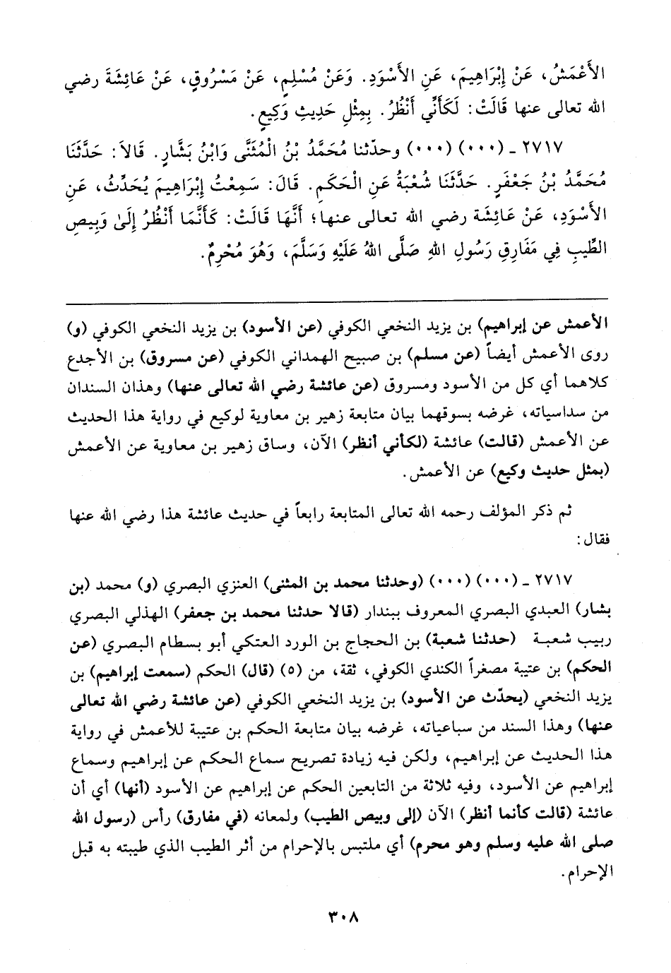 ٢٧١٧ - (٠٠) (٠٠) وحدّثنا مُحَمَّدُ بْنُ الْمُثَنَّى وَابْنُ بَشَّارٍ. قَالا: حَدَّثَنَا مُحَمَّدُ بْنُ جَعْفَرٍ. حَدَّثَنَا شُعْبَةُ عَنِ الْحَكَمِ. قَال: سَمِعْتُ إِبْرَاهِيمَ يُحَدِّثُ، عَنِ الأَسْوَدِ، عَنْ عَائِشَة رضي الله تعالى عنها؛ أَنَّهَا قَالتْ: كَأَنَّمَا أَنْظُرُ إِلَى وَبِيصِ الطِّيبِ فِي مَفَارِقِ رَسُولِ اللهِ صَلَّى اللهُ عَلَيهِ وَسَلَّمَ، وَهُوَ مُحْرِمٌ