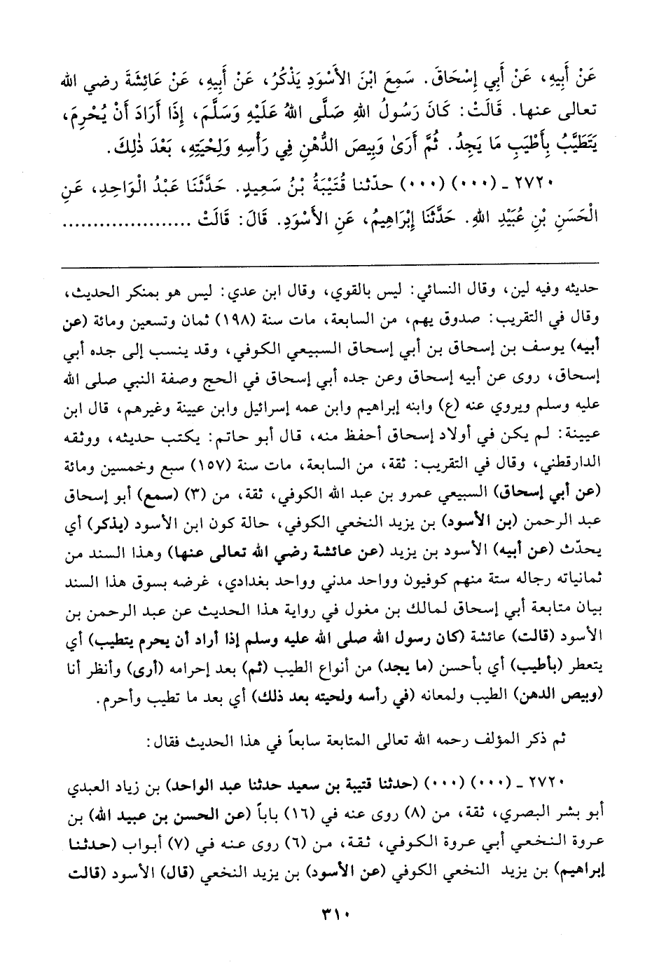 عَنْ أَبِيهِ، عَنْ أَبِي إِسْحَاقَ. سَمِعَ ابْنَ الأَسْوَدِ يَذْكُرُ، عَنْ أَبِيهِ، عَنْ عَائِشَةَ رضي الله تعالى عنها. قَالتْ: كَانَ رَسُولُ اللهِ صَلَّى اللهُ عَلَيهِ وَسَلَّمَ، إِذَا أَرَادَ أَنْ يُحْرِمَ، يَتَطَيَّبُ بِأَطْيَبِ مَا يَجِدُ. ثُمَّ أَرَى وَبِيصَ الدُّهْنِ فِي رَأسِهِ وَلحْيَتِهِ، بَعْدَ ذلِكَ.