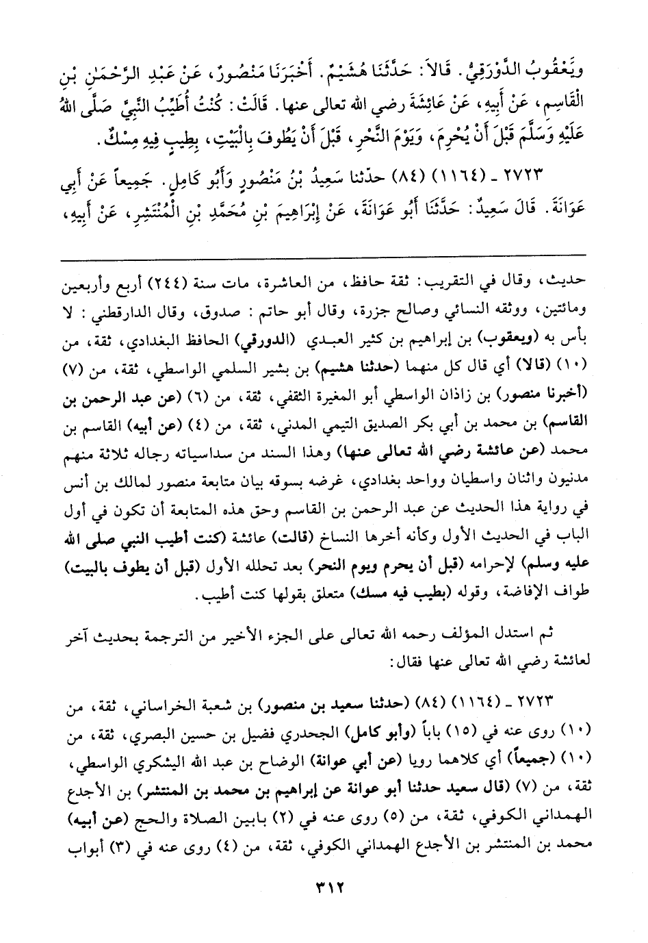 ويَعْقُوبُ الدَّوْرَقِيُّ. قَالا: حَدَّثَنَا هُشَيمٌ. أَخْبَرَنَا مَنْصُورٌ، عَنْ عَبْدِ الرَّحْمَنِ بْنِ الْقَاسِمِ، عَنْ أَبِيهِ، عَنْ عَائِشَةَ رضي الله تعالى عنها. قَالتْ: كُنْتُ أُطَيِّبُ النَّبِيِّ صَلَّى اللهُ عَلَيهِ وَسَلَّمَ قَبْلَ أَنْ يُحْرِمَ، وَيوْمَ النَّحْرِ، قَبْلَ أَنْ يَطُوفَ بِالْبَيتِ، بِطِيبٍ فِيهِ مِسْكٌ.