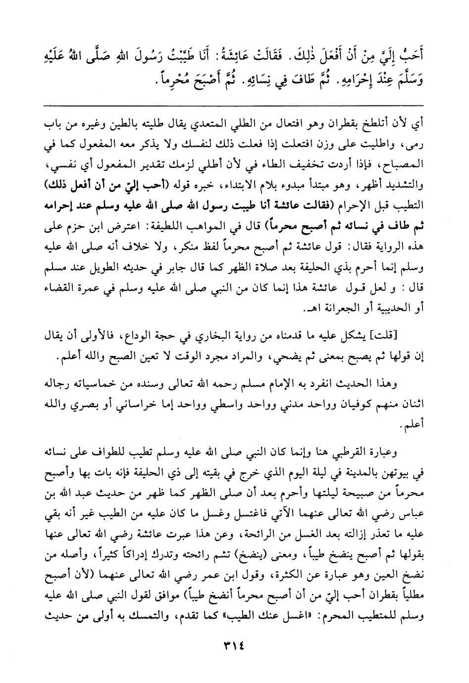 وعبارة القرطبي هنا وإنما كان النبي صلى الله عليه وسلم تطيب للطواف على نسائه في بيوتهن بالمدينة في ليلة اليوم الذي خرج في بقيته إلى ذي الحليفة فإنه بات بها وأصبح محرمًا من صبيحة ليلتها وأحرم بعد أن صلى الظهر كما ظهر من حديث عبد الله بن عباس رضي الله تعالى عنهما الآتي فاغتسل وغسل ما كان عليه من الطيب غير أنه بقي عليه ما تعذر إزالته بعد الغسل من الرائحة، وعن هذا عبرت عائشة رضي الله تعالى عنها بقولها ثم أصبح ينضخ طيبًا، ومعنى (ينضخ) تشم رائحته وتدرك إدراكًا كثيرًا، وأصله من نضخ العين وهو عبارة عن الكثرة، وقول ابن عمر رضي الله تعالى عنهما (لأن أصبح مطليًا بقطران أحب إليَّ من أن أصبح محرمًا أنضخ طيبًا) موافق لقول النبي صلى الله عليه وسلم للمتطيب المحرم: "اغسل عنك الطيب" كما تقدم، والتمسك به أولى من حديث