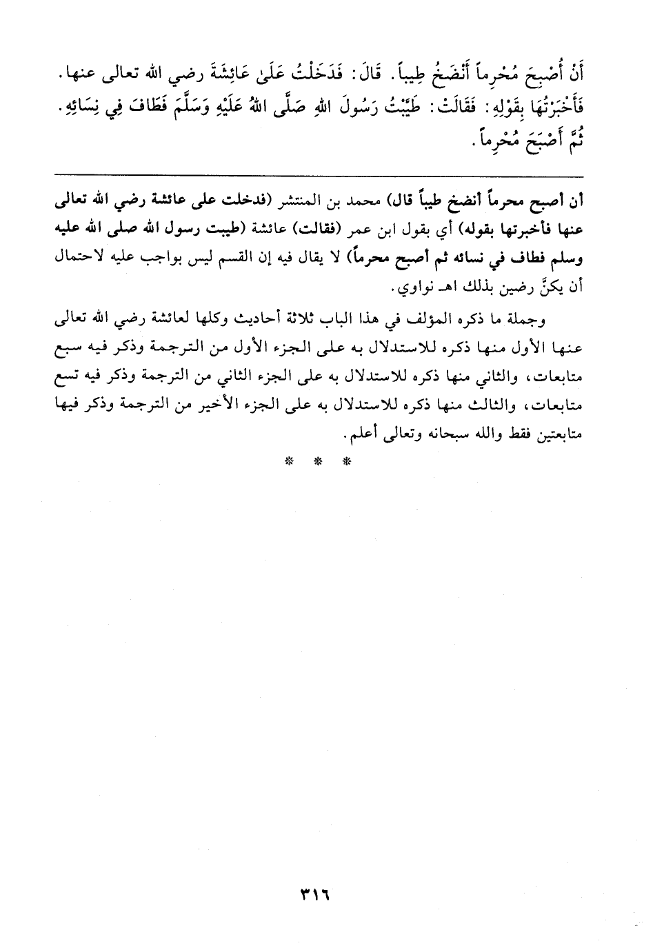 أَنْ أُصْبِحَ مُحْرِمًا أَنْضَخُ طِيبًا. قَال: فَدَخَلْتُ عَلَى عَائِشَةَ رضي الله تعالى عنها. فَأَخْبَرْتُهَا بِقَوْلِهِ: فَقَالتْ: طَيَّبْتُ رَسُولَ اللهِ صَلَّى اللهُ عَلَيهِ وَسَلمَ فَطَافَ فِي نِسَائِهِ. ثُمَّ أَصْبَحَ مُحْرِمًا
