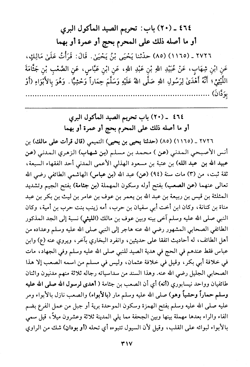 ٢٧٢٦ - (١١٦٥) (٨٥) (حدثنا يحيى بن يحيى) التميمي (قال قرأت على مالك) بن أنس الأصبحي المدني (عن) محمد بن مسلم (بن شهاب) الزهري المدني (عن عبيد الله بن عبد الله) بن عتبة بن مسعود الهذلي الأعمى المدني أحد الفقهاء السبعة، ثقة ثبت، من (٣) مات سنة (٩٤) (عن) عبد الله (بن عباس) الهاشمي الطائفي رضي الله تعالى عنهما (عن الصعب) بفتح أوله وسكون المهملة (بن جثامة) بفتح الجيم وتشديد المثلثة بن قيس بن ربيعة بن عبد الله بن يعمر بن عوف بن عامر بن ليث بن بكر بن عبد مناة بن كنانة، وكان ابن أخت أبي سفيان بن حرب، أمه زينب بنت حرب بن أمية، وكان النبي صلى الله عليه وسلم آخى بينه وبين عوف بن مالك (الليثي) نسبة إلى الجد المذكور الطائفي الصحابي المشهور رضي الله عنه هاجر إلى النبي صلى الله عليه وسلم وعداده من أهل الطائف، له أحاديث اتفقا على حديثين، وانفرد البخاري بآخر، ويروي عنه (ع) وابن عباس فقط عندهم في الحج في هدية الصيد للنبي صلى الله عليه وسلم وفي الجهاد، مات في خلافة أبي بكر، وقيل في خلافة عثمان، وليس في مسلم من اسمه الصعب إلا هذا الصحابي الجليل رضي الله عنه. وهذا السند من سداسياته رجاله ثلاثة منهم مدنيون واثنان طائفيان وواحد نيسابوري (أنه) أي أن الصعب بن جثامة (أهدى لرسول الله صلى الله عليه وسلم حمارًا وحشيًّا وهو) صلى الله عليه وسلم مار (بالأبواء) والصعب نازل بالأبواء ومر عليه صلى الله عليه وسلم بفتح الهمزة وسكون الموحدة برية أو جبل من عمل الفرع بضم الفاء والراء بعدها مهملة بينها وبين الجحفة مما يلي المدينة ثلاثة وعشرون ميلًا، قيل سمي بالأبواء لبوائه على القلب، وقيل لأن السيول تتبوءه أي تحله (أو بودان) شك من الراوي