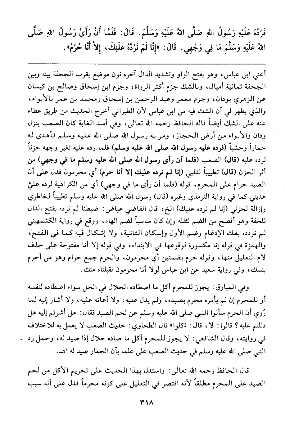 فَرَدَّهُ عَلَيهِ رَسُولُ اللهِ صَلَّى اللهُ عَلَيهِ وَسَلَّمَ. قَال: فَلَمَّا أَنْ رَأَى رَسُولُ اللهِ صَلَّى اللهُ عَلَيهِ وَسَلَّمَ مَا فِي وَجْهِي. قَال: "إِنَّا لَمْ نَرُدَّهُ عَلَيكَ، إلا أنَّا حُرُمٌ"